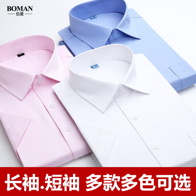 伯曼春秋季男士长袖衬衫商务韩版修身职业工装白色大码短袖衬衣寸