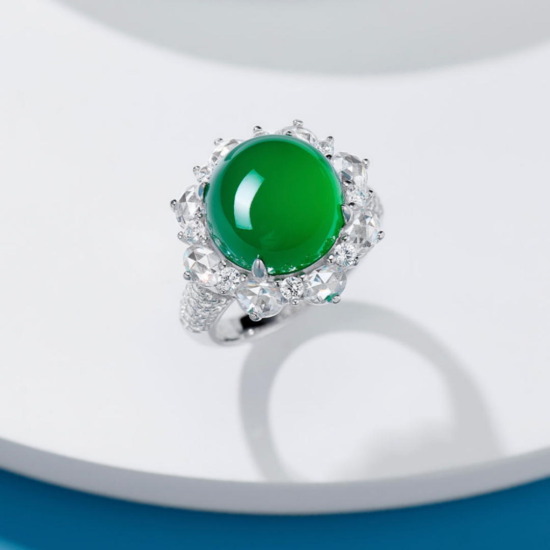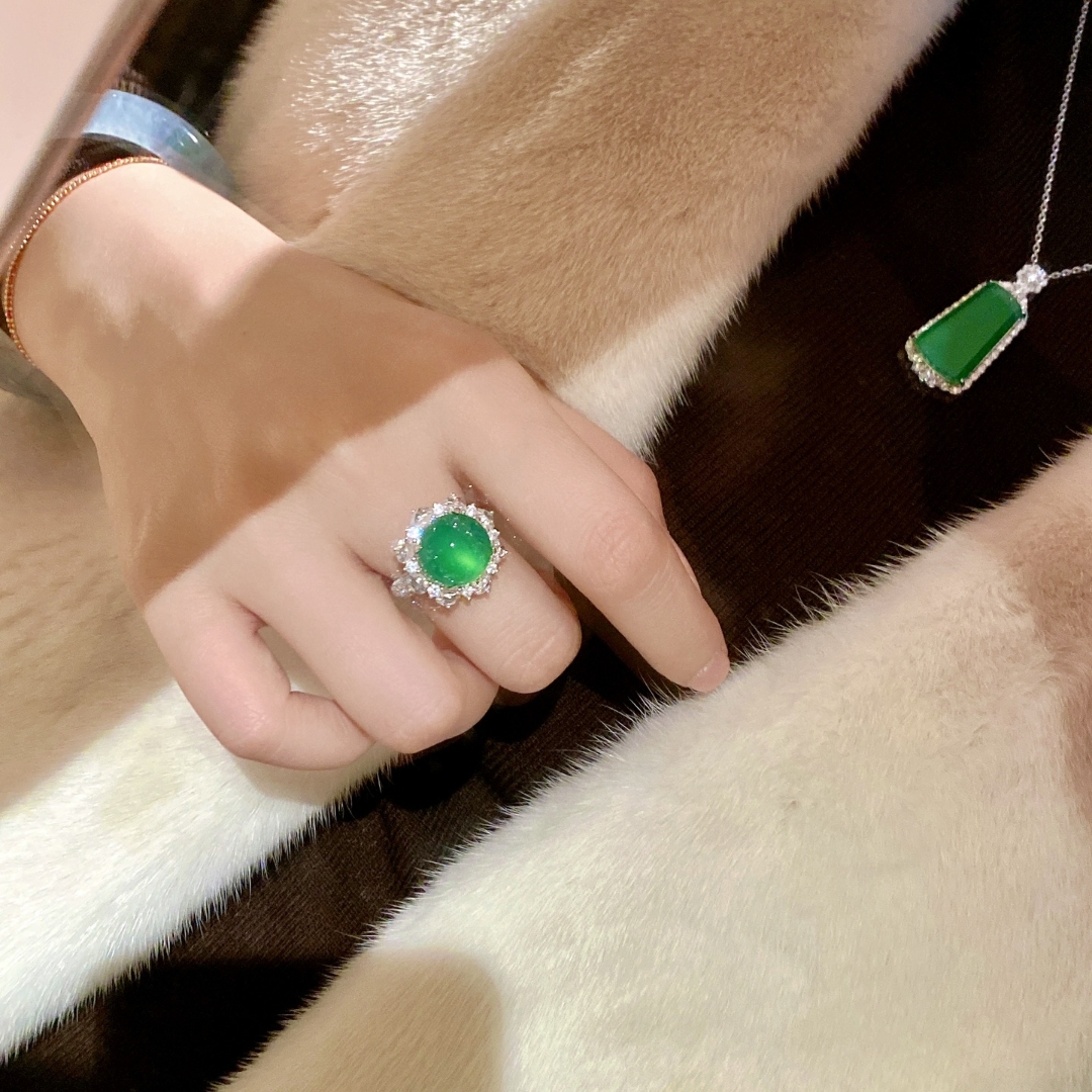 圆形绿玉髓围镶满钻戒指女925纯银轻奢新中式高级感阳绿媲美翡翠