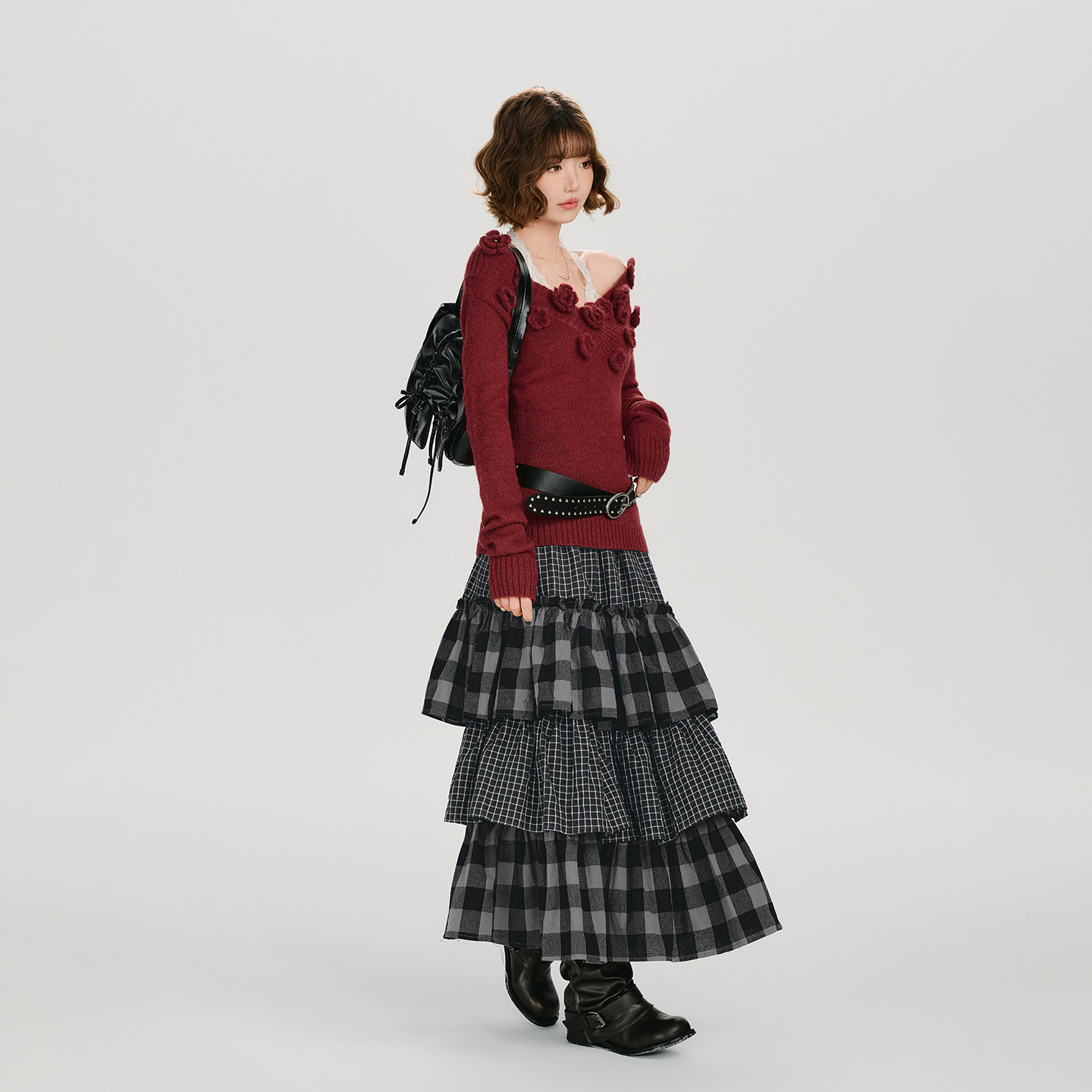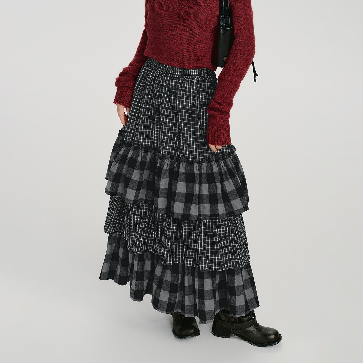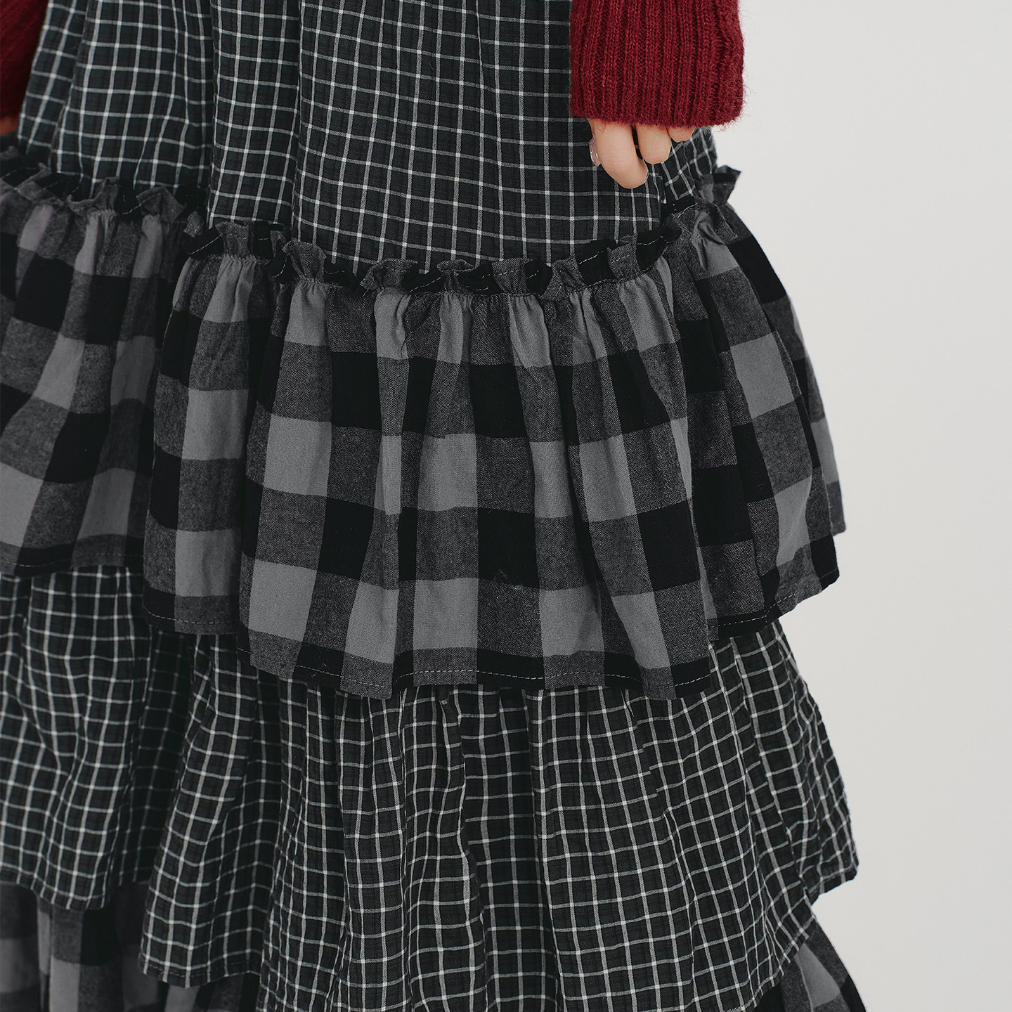 Girlyhalo美式复古格纹拼接多层裙摆半身裙女秋新款宽松蛋糕长裙
