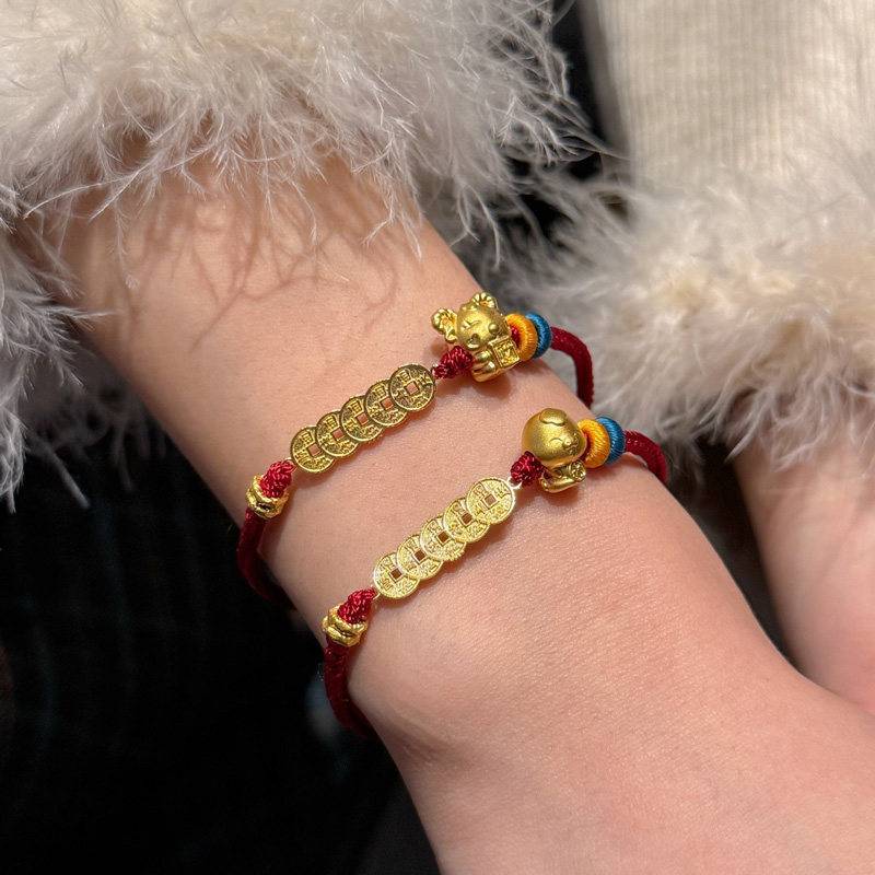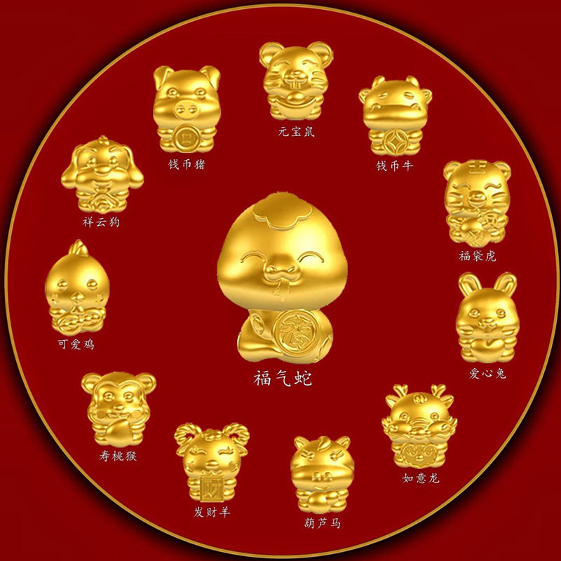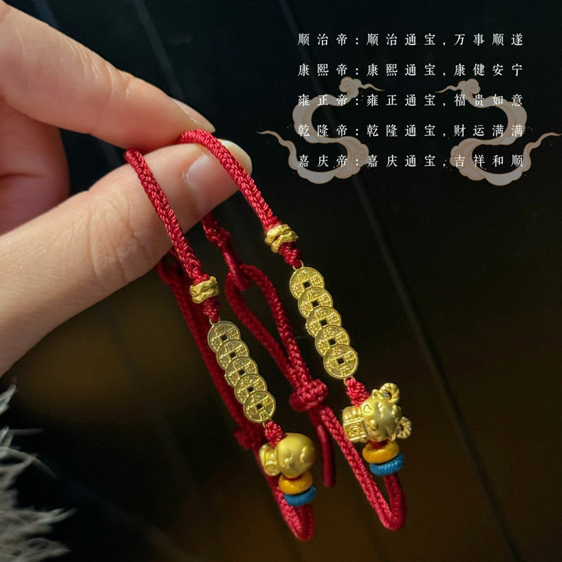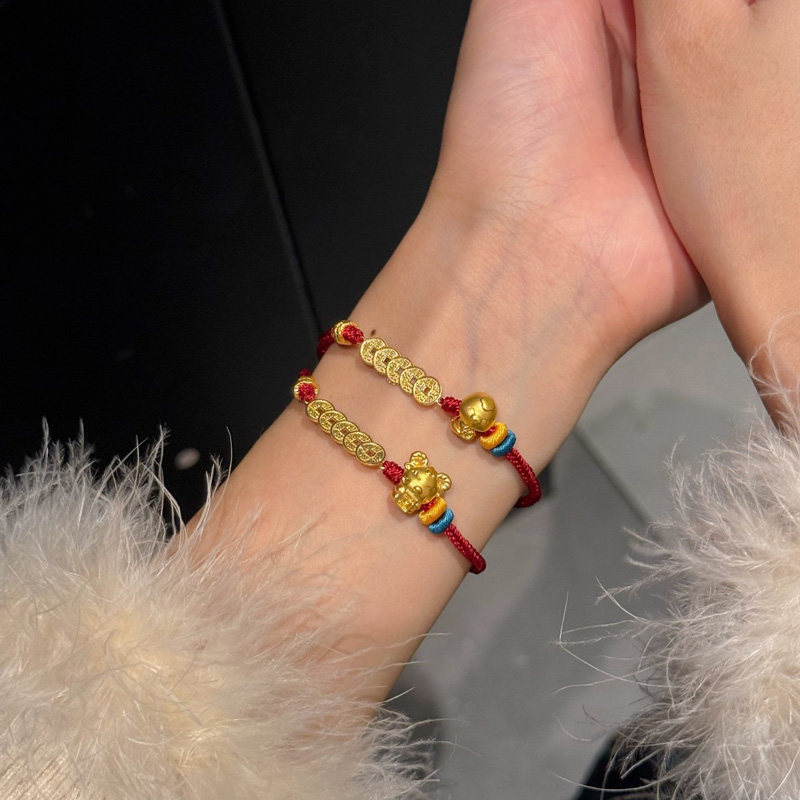 吉盟珠宝足金红绳手串3D硬金十二生肖18K金五帝钱生肖蛇转运珠