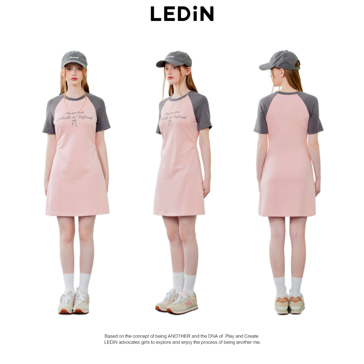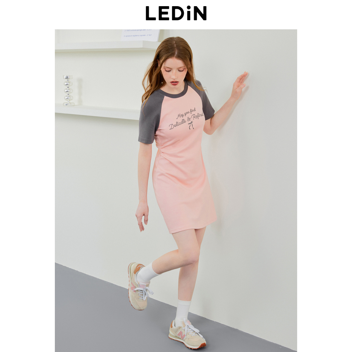 乐町插肩袖连衣裙夏季新款抽褶连衣裙收腰短袖粉色针织T恤裙