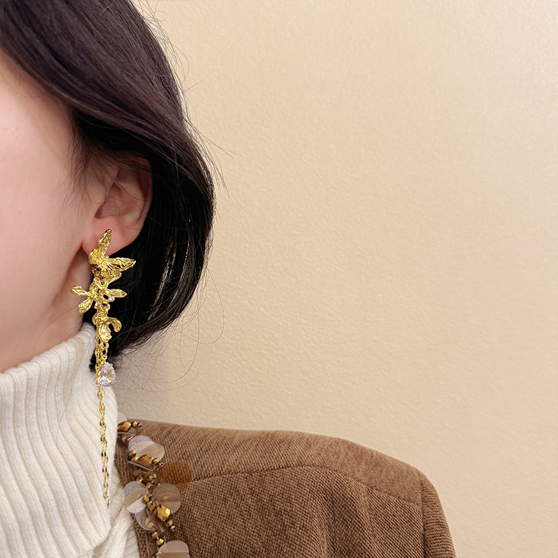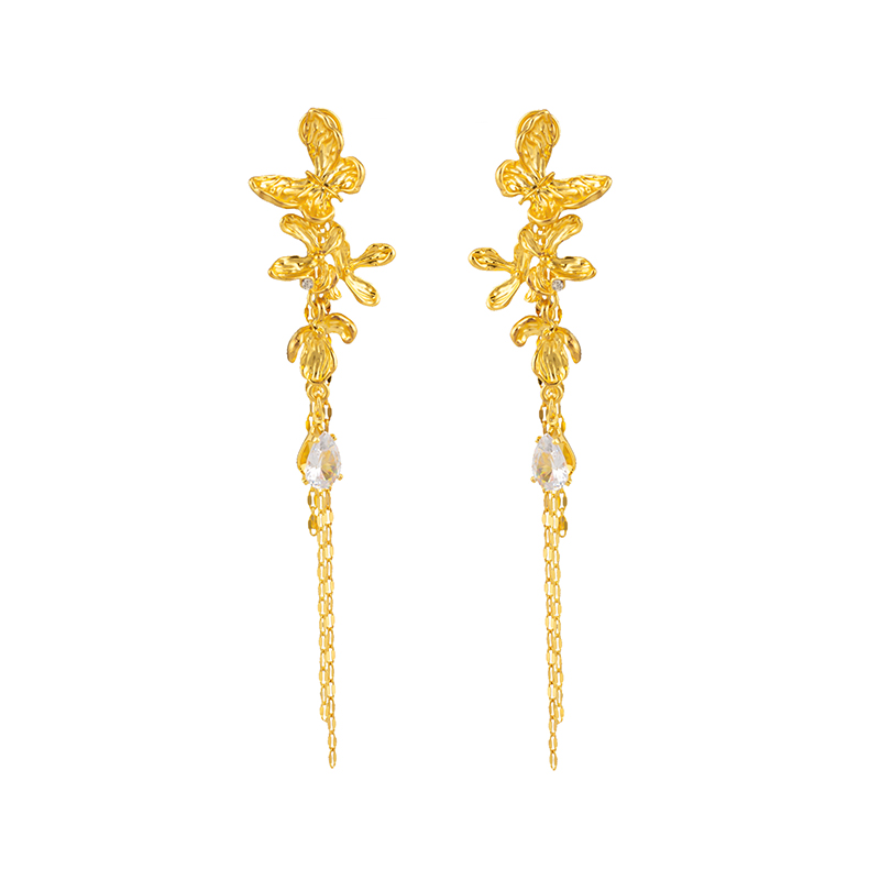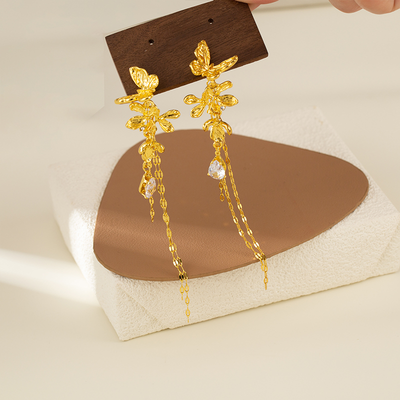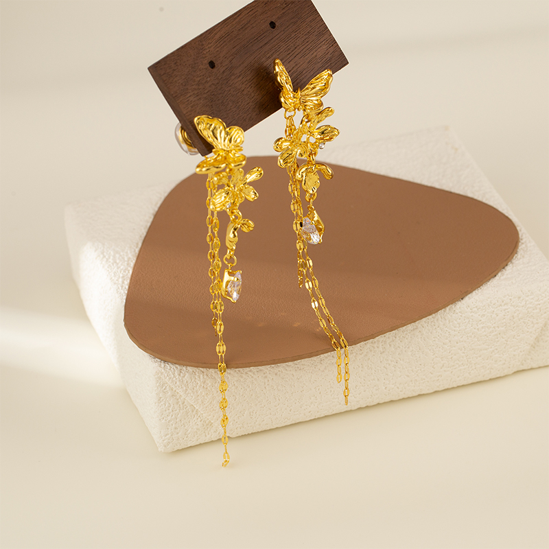 时尚大气金色金属感长款流苏蝴蝶锆石耳饰耳环蚊香盘耳夹无耳洞女
