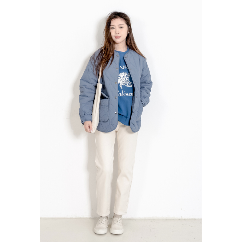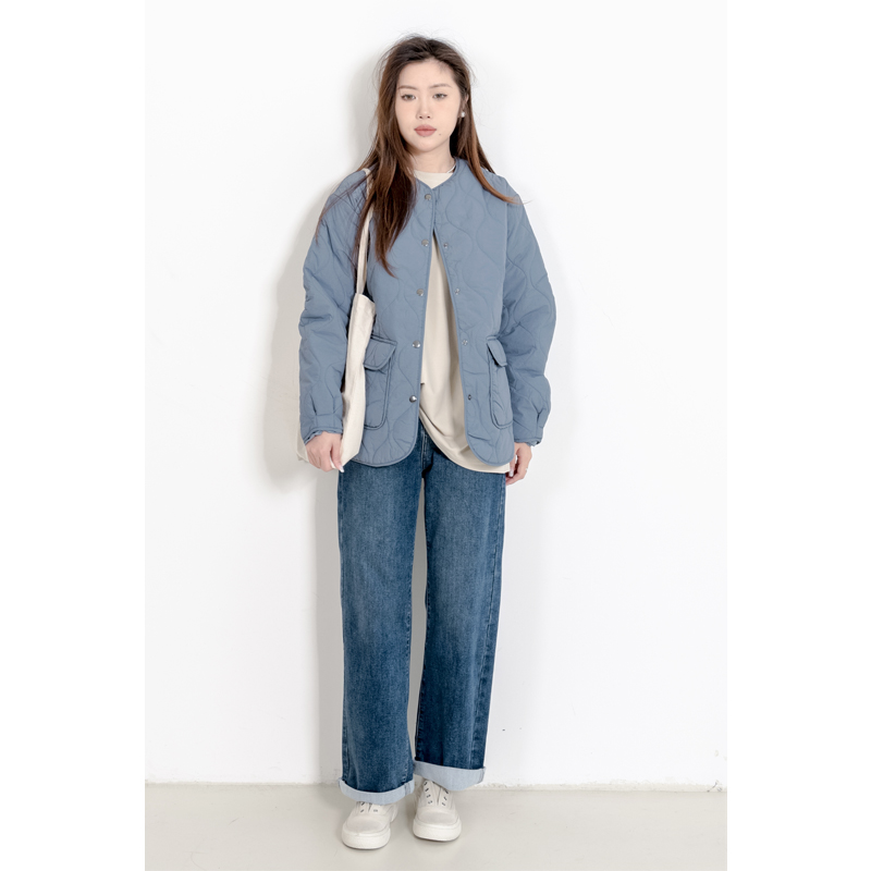 KNgs 冬季复古日系菱形格纯色短款开衫圆领内胆薄款棉衣外套女