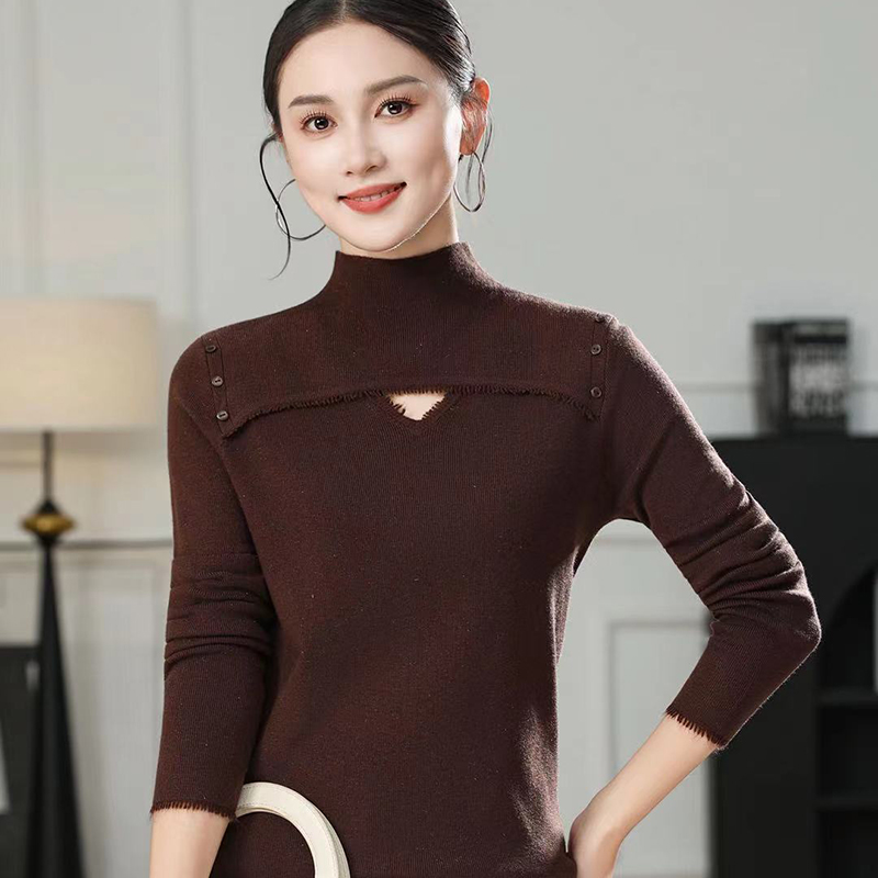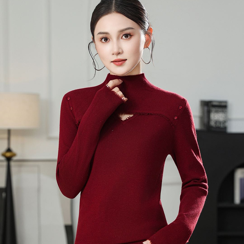 修身设计感镂空半高领长袖针织衫女2025秋冬新款气质打底毛衣