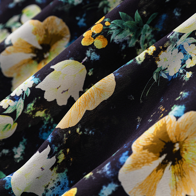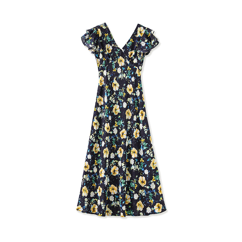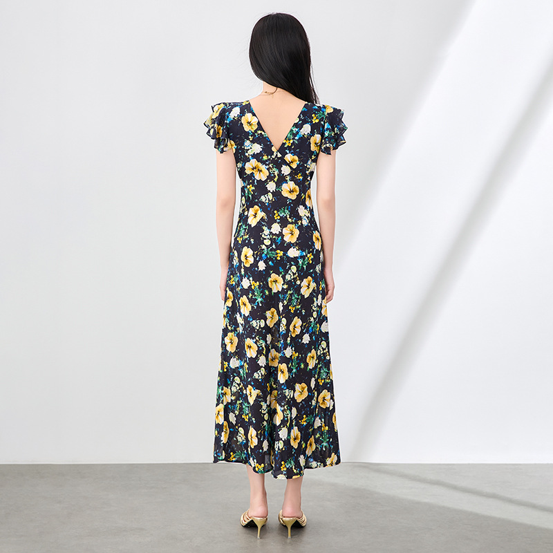 2025夏季新款法式荷叶边袖印花桑蚕丝真丝V领连衣裙收腰显瘦长裙