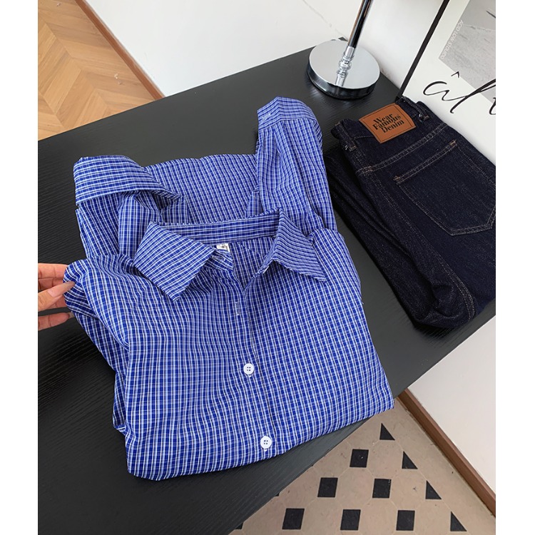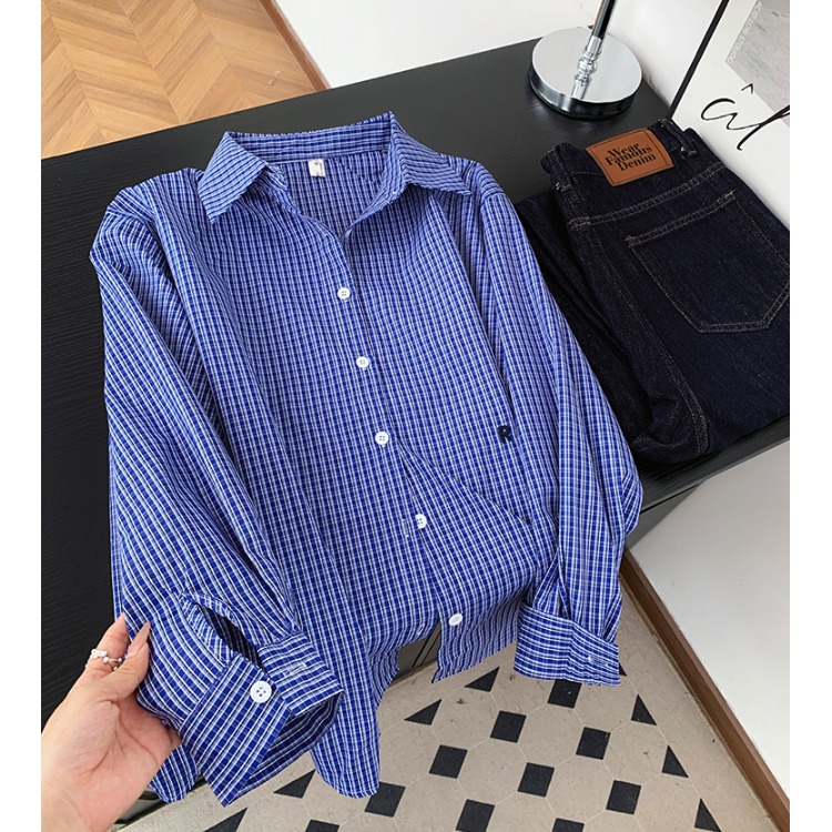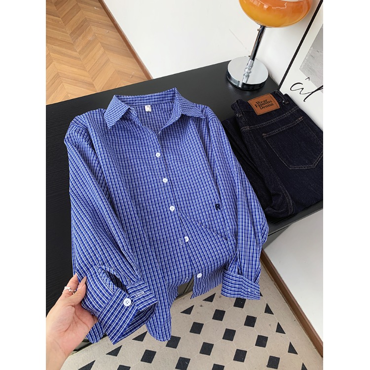 复古风蓝色小格子长袖衬衫女秋冬2025新款气质休闲百搭中长款上衣