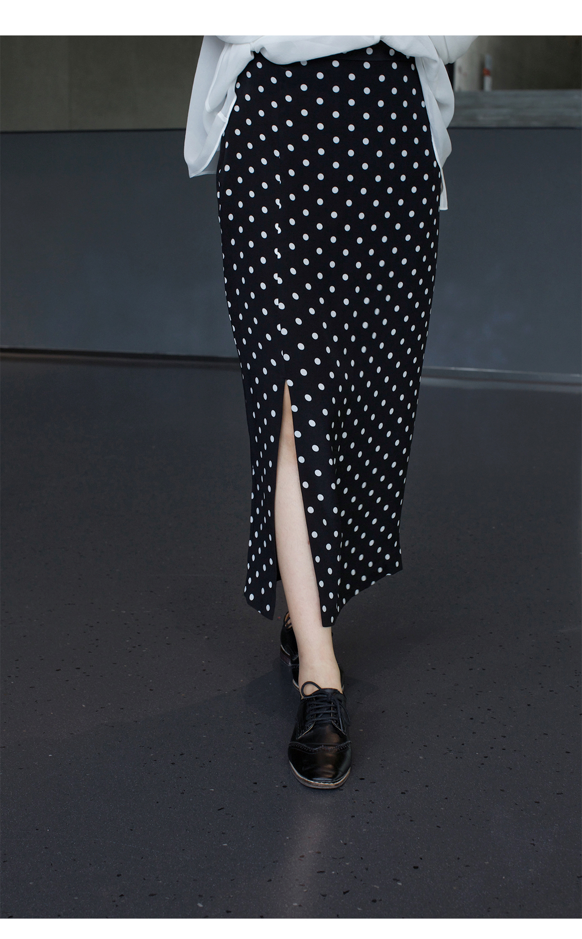 Yuanyin秋复古优雅长款黑一步裙开衩包臀裙包裙波点真丝半身裙女