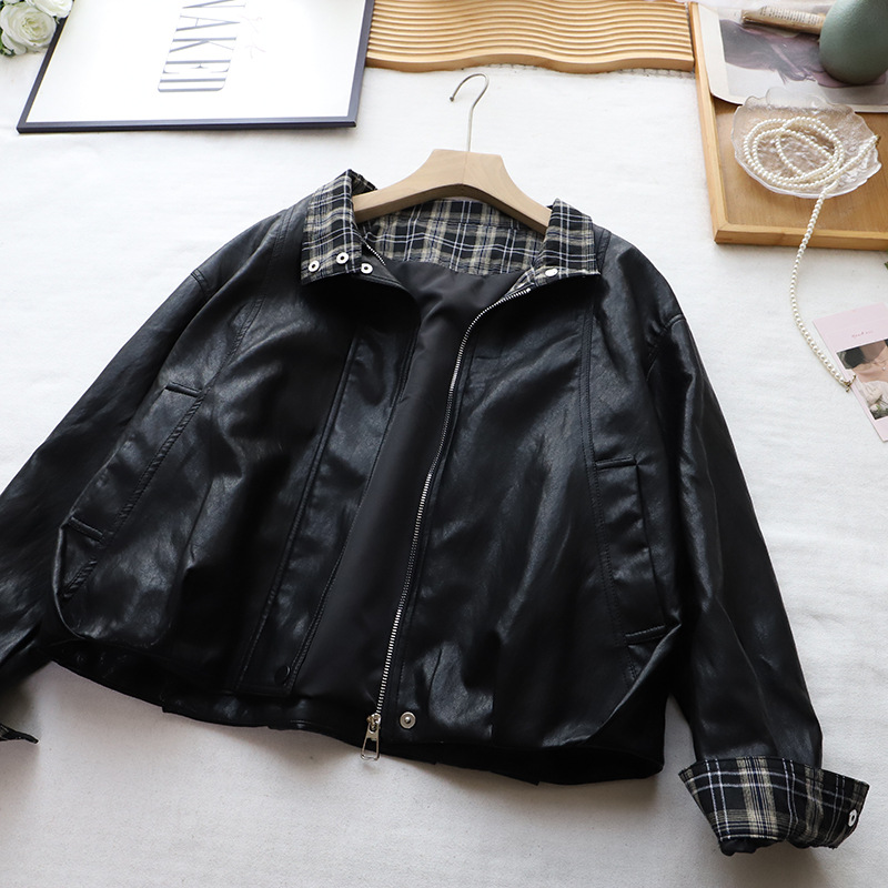 [比正]2025秋冬新韩版格子时髦复古百搭小个子炸街短款皮衣女