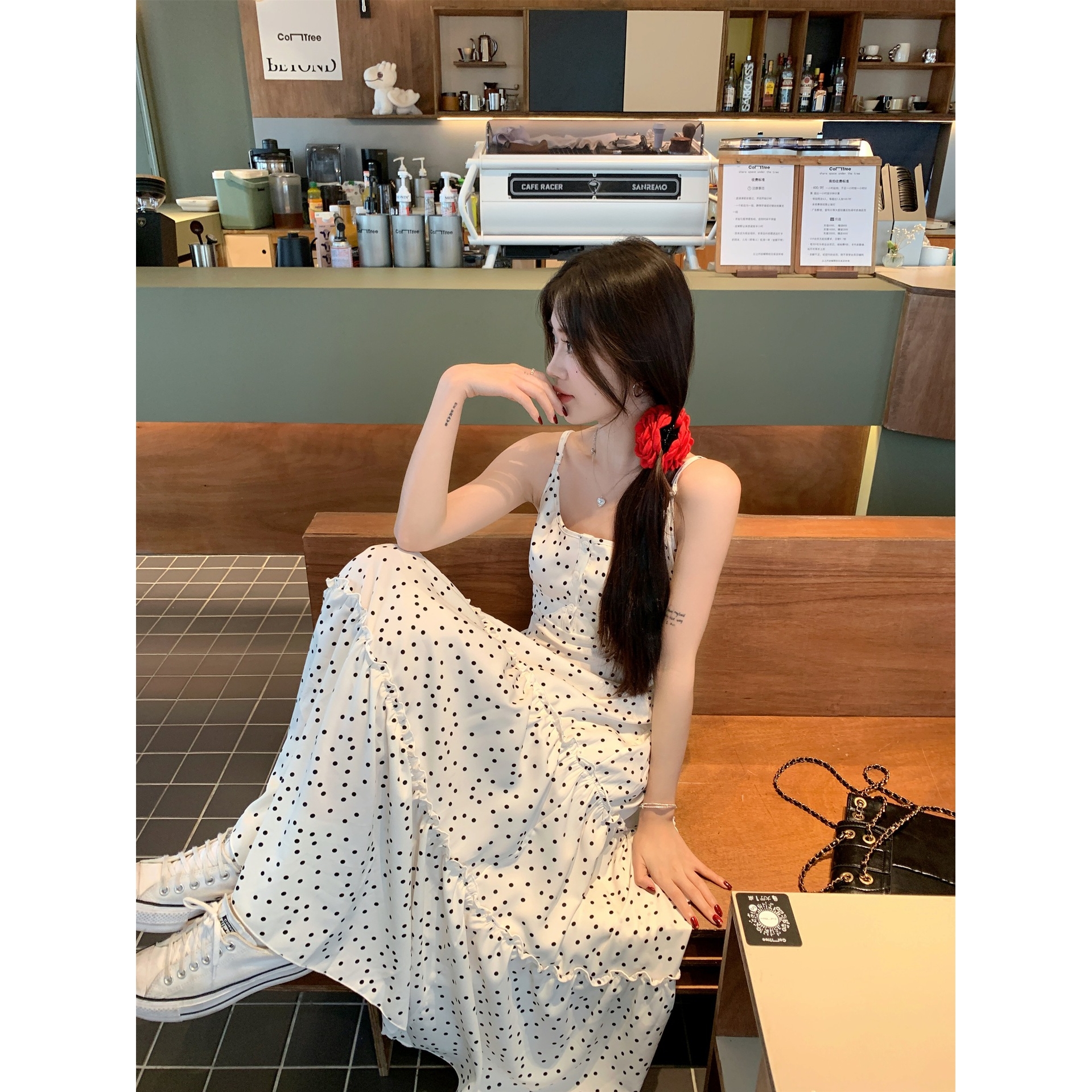 荷叶边波点吊带连衣裙女夏季2025新款韩系高级感收腰修身显瘦长裙