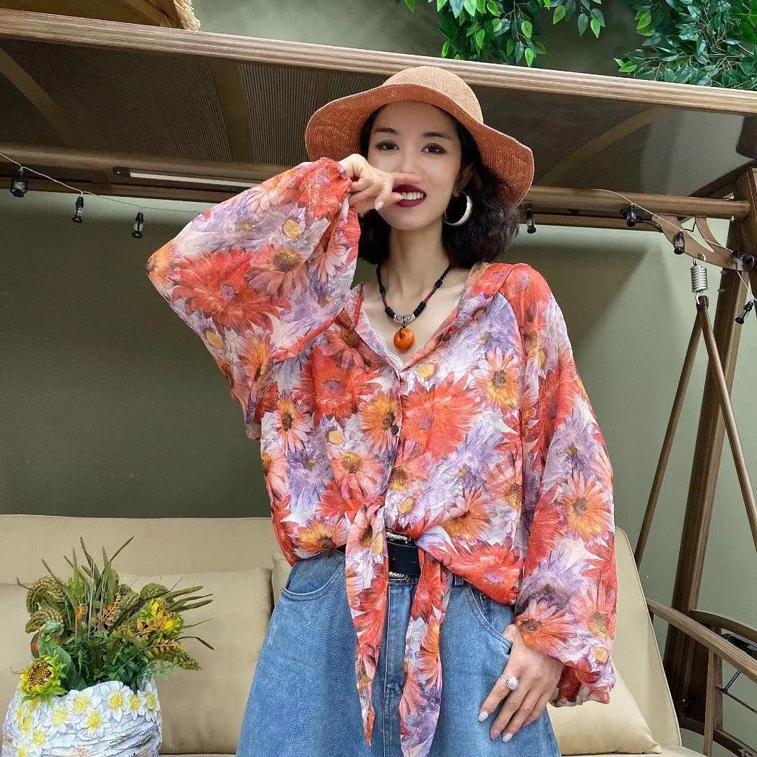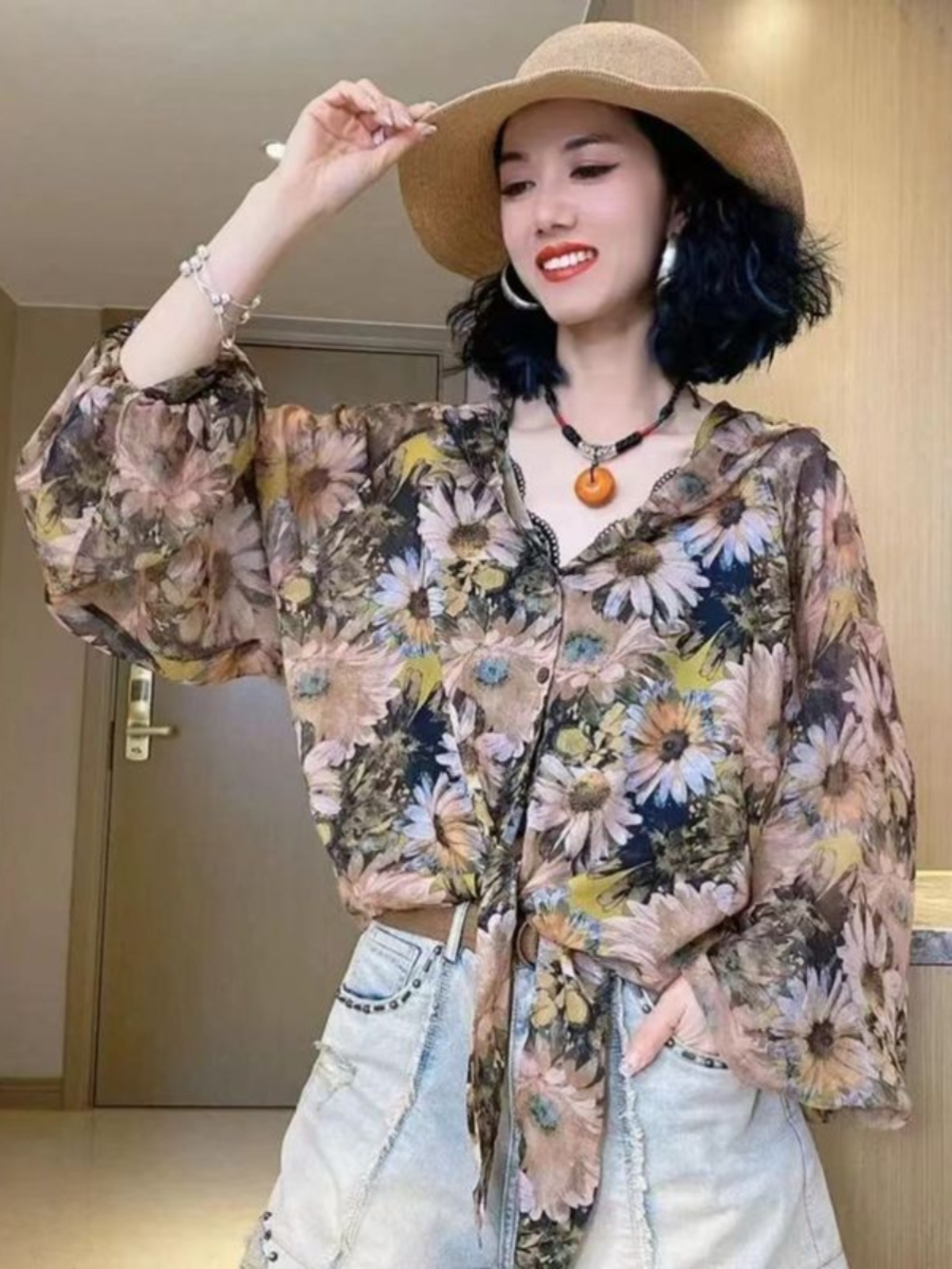 防晒衣女款夏季2025新款开衫印花衬衫女连帽长袖灯笼袖薄款雪纺衫