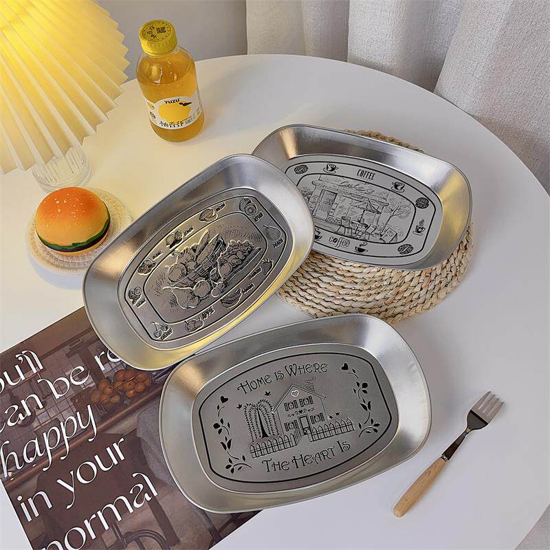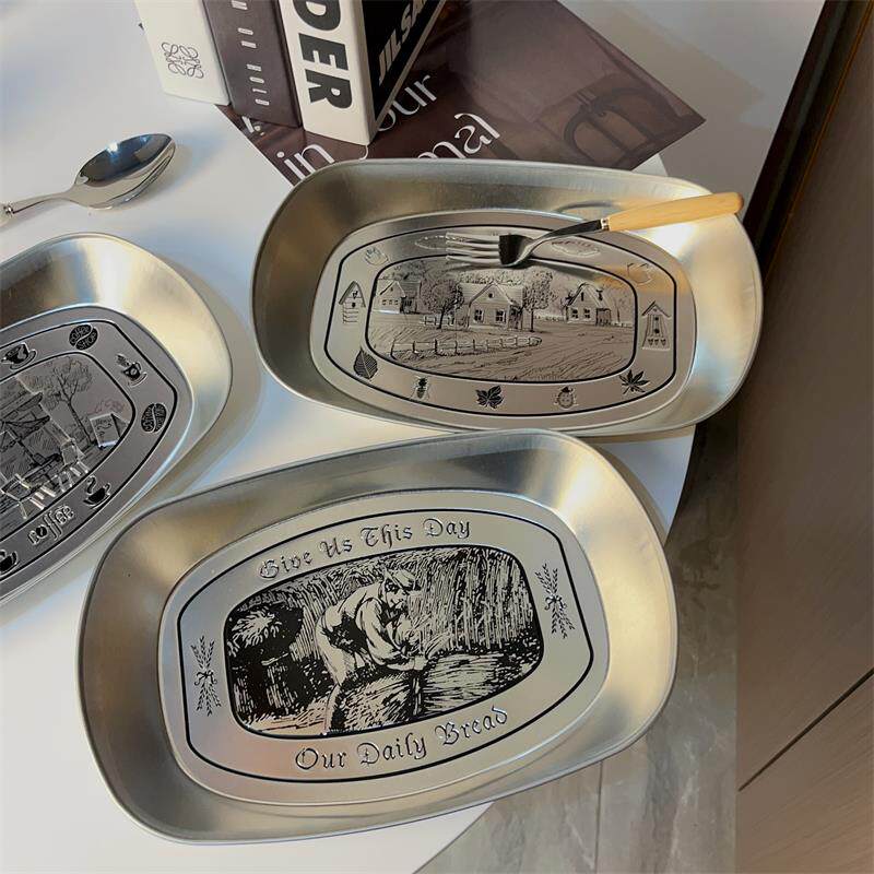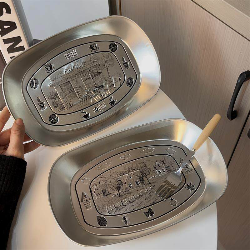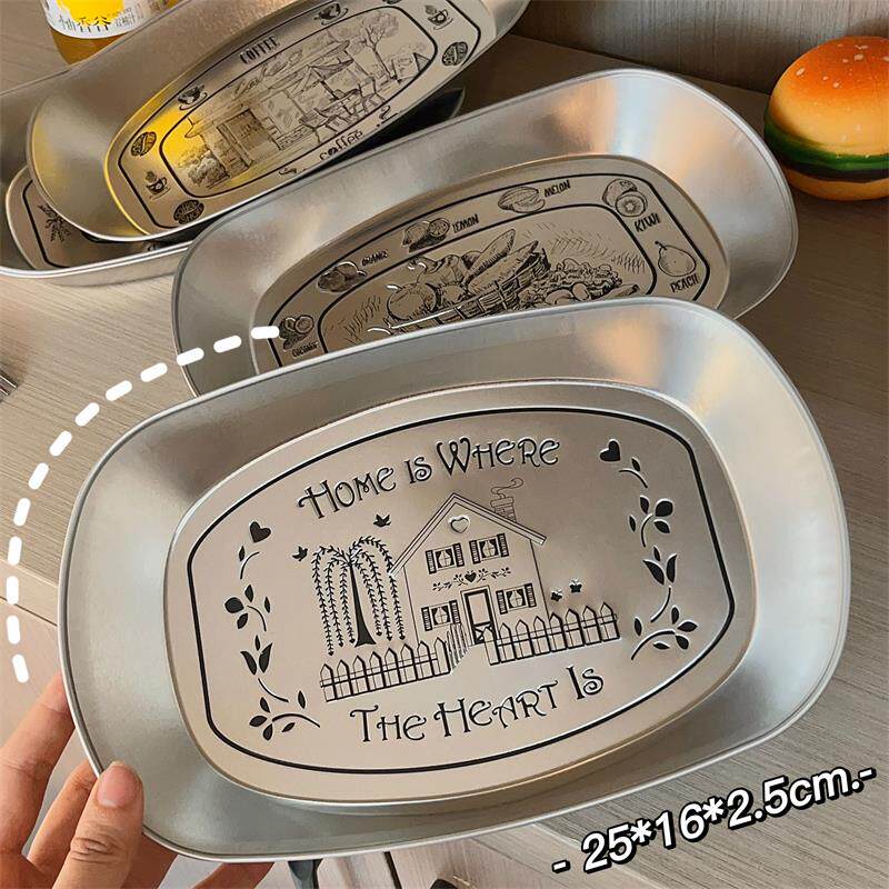 复古马口铁托盘家用不锈钢野餐盘小吃蛋糕烧烤水果盘ins风菜盘子