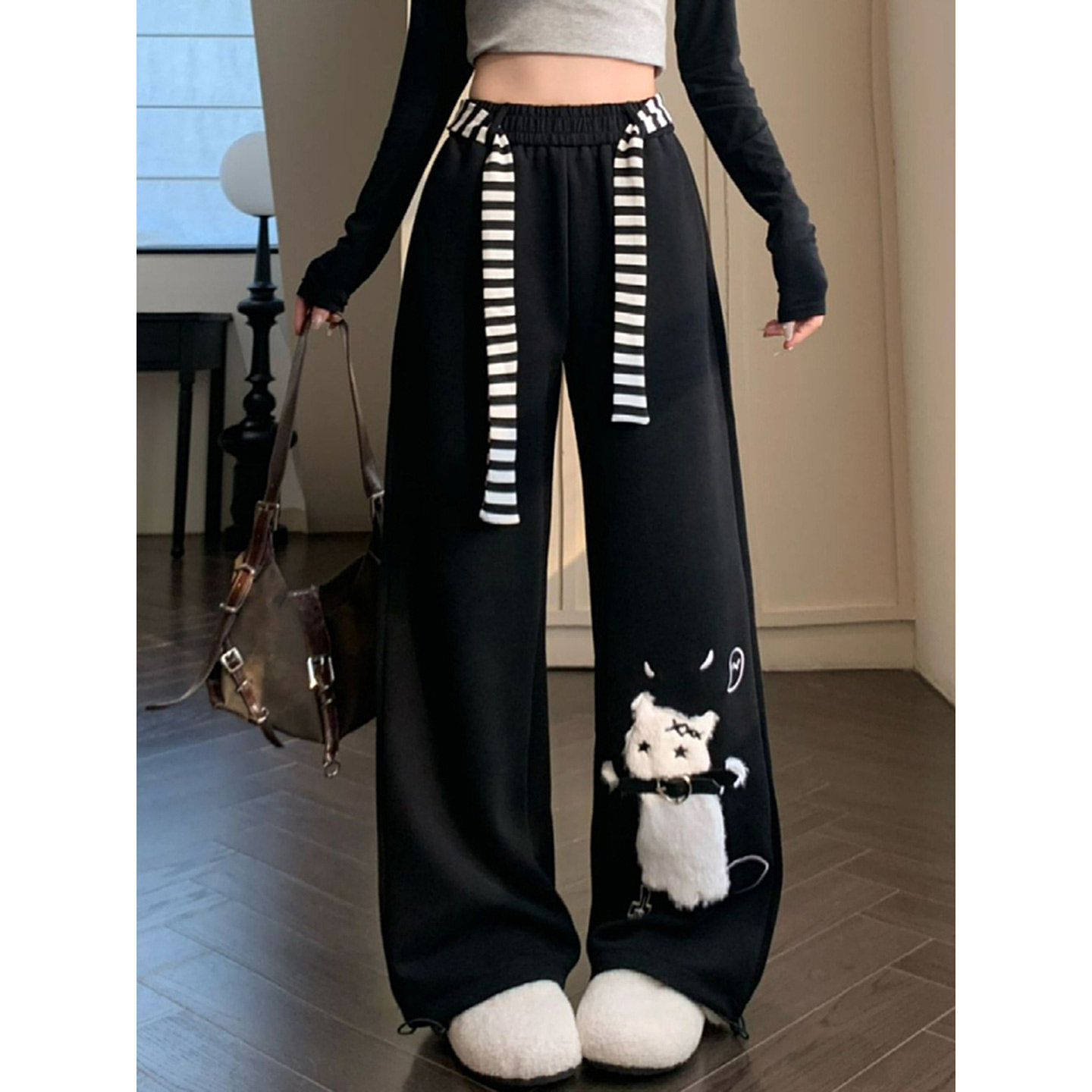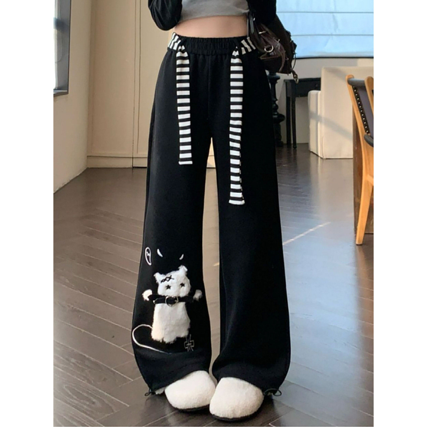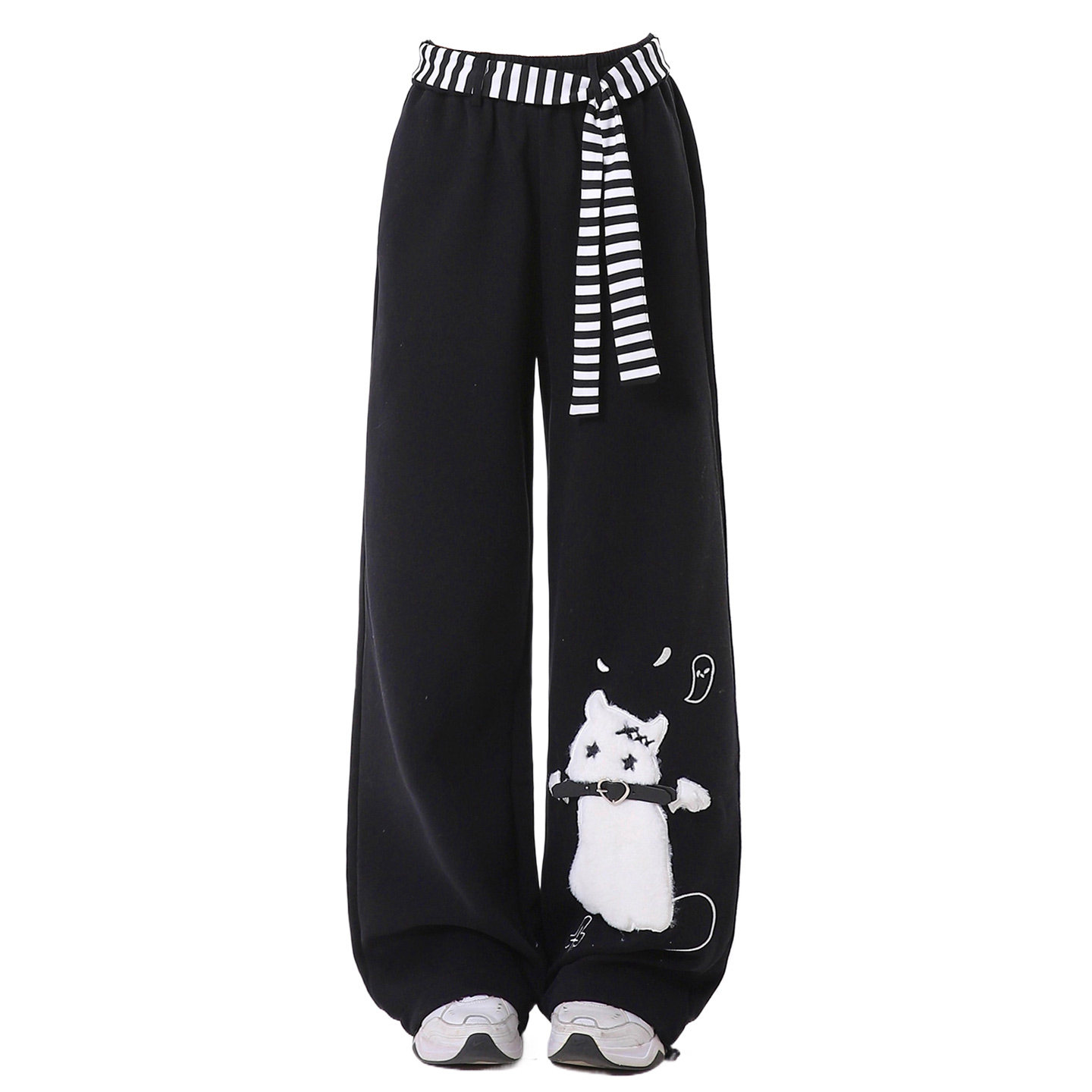 大码胖mm宽松休闲卫裤女冬季新款可爱猫咪加绒加厚黑色阔腿运动裤