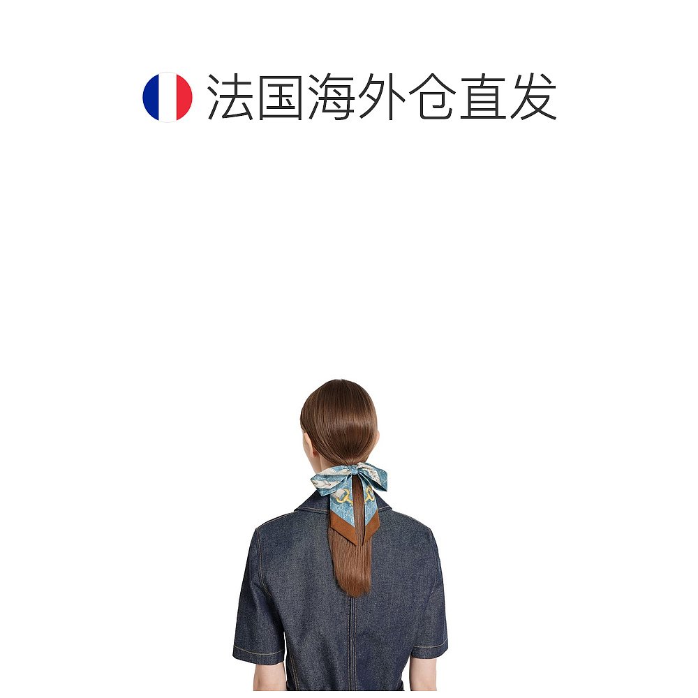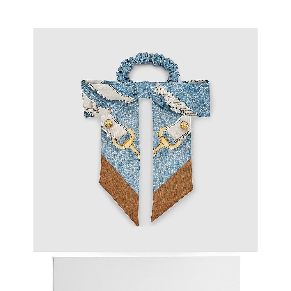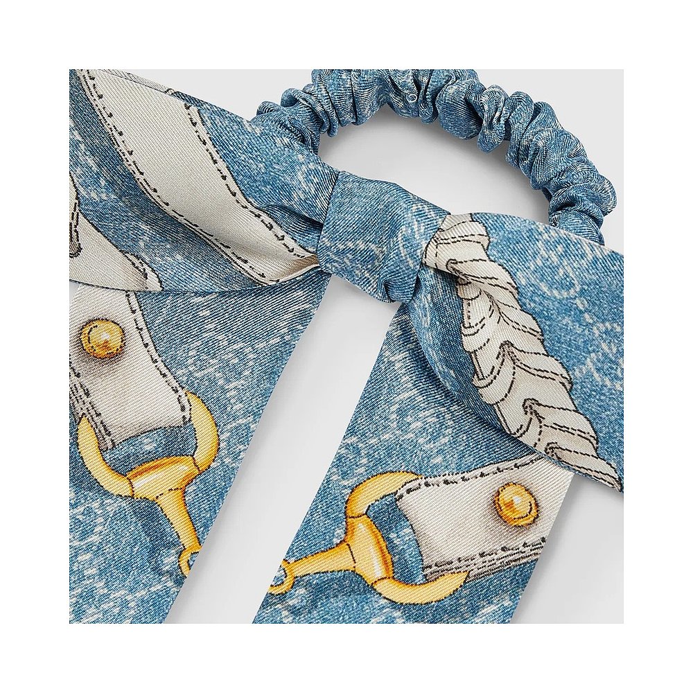 自营欧洲直邮Gucci/古驰 女士浅蓝色真丝斜纹双G牛仔马术印花发圈
