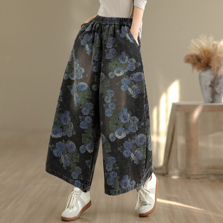 复古印花牛仔阔腿裤女春季胖MM松紧腰显瘦洋气大码休闲直筒九分裤