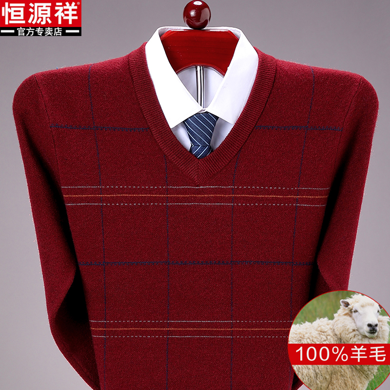 恒源祥冬季纯羊毛衫男士鸡心领加厚本命年红色中老年爸爸V领毛衣