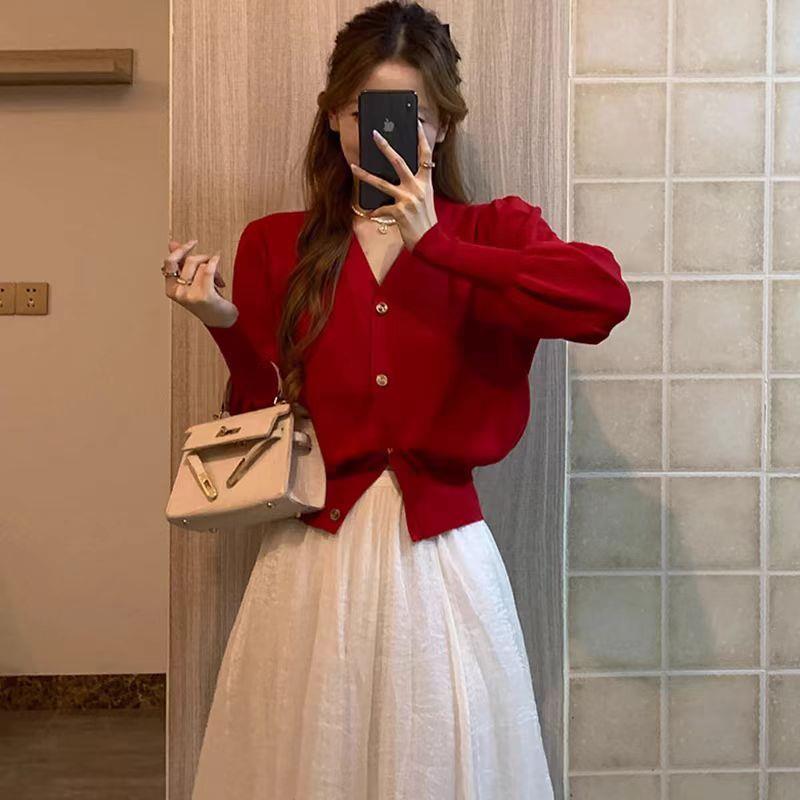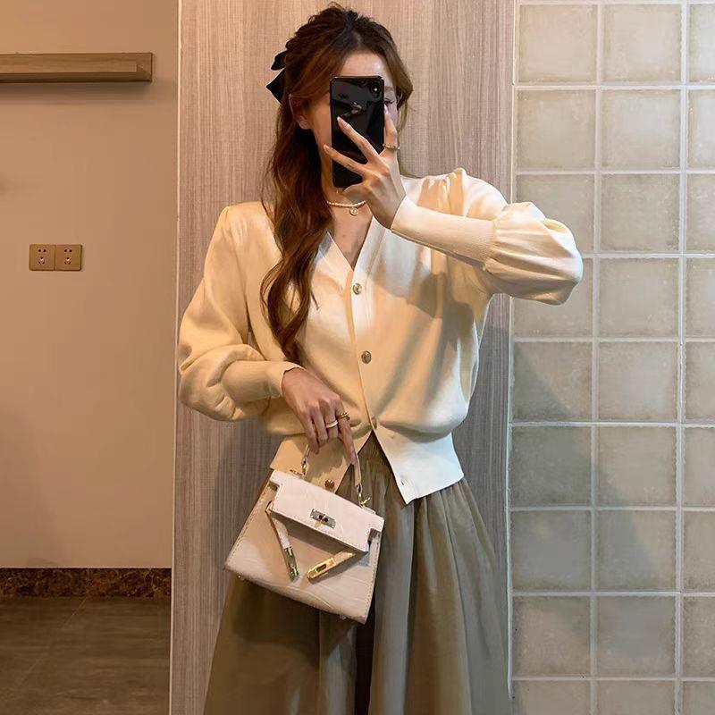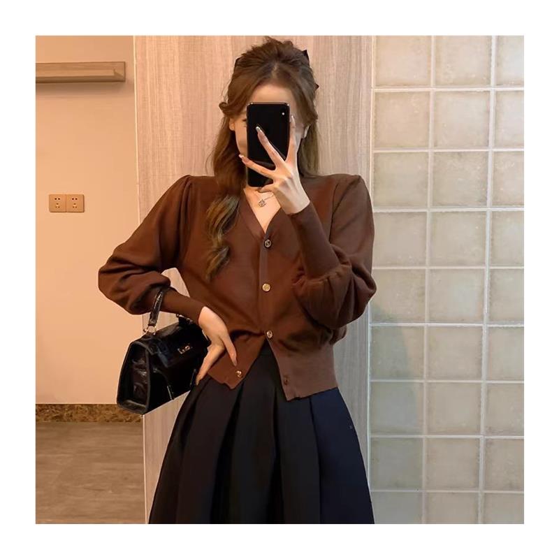 好货黑色V领针织开衫女2025秋冬收腰短款修身毛衣外套洋气泡泡袖