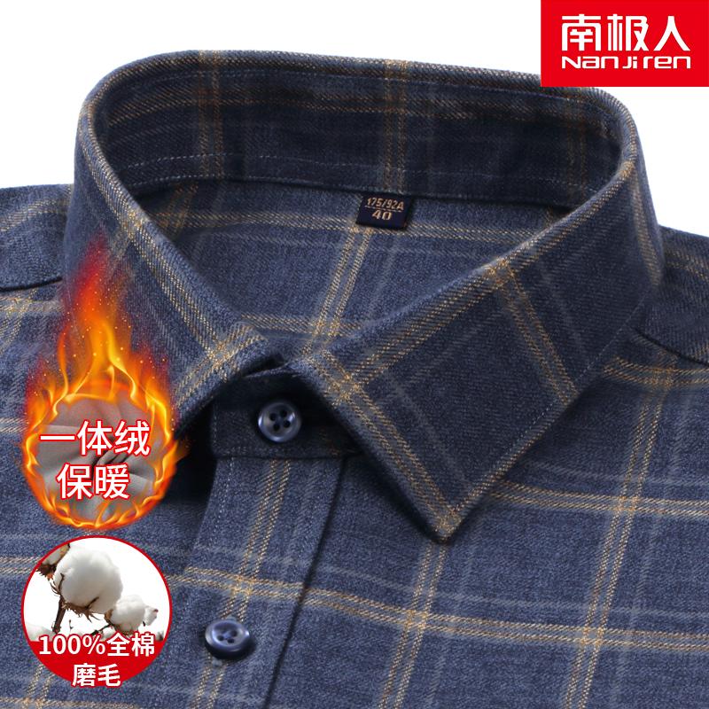 南极人保暖衬衫男纯棉磨毛一体绒加绒加厚大格子中年爸爸装衬衣冬
