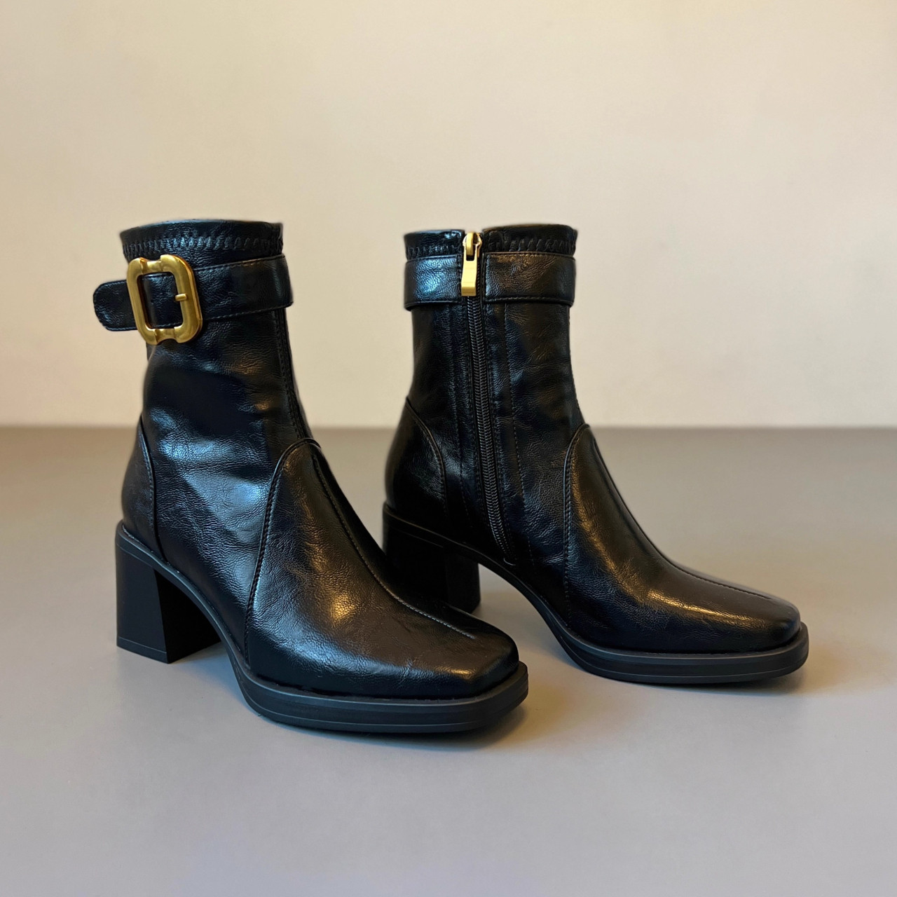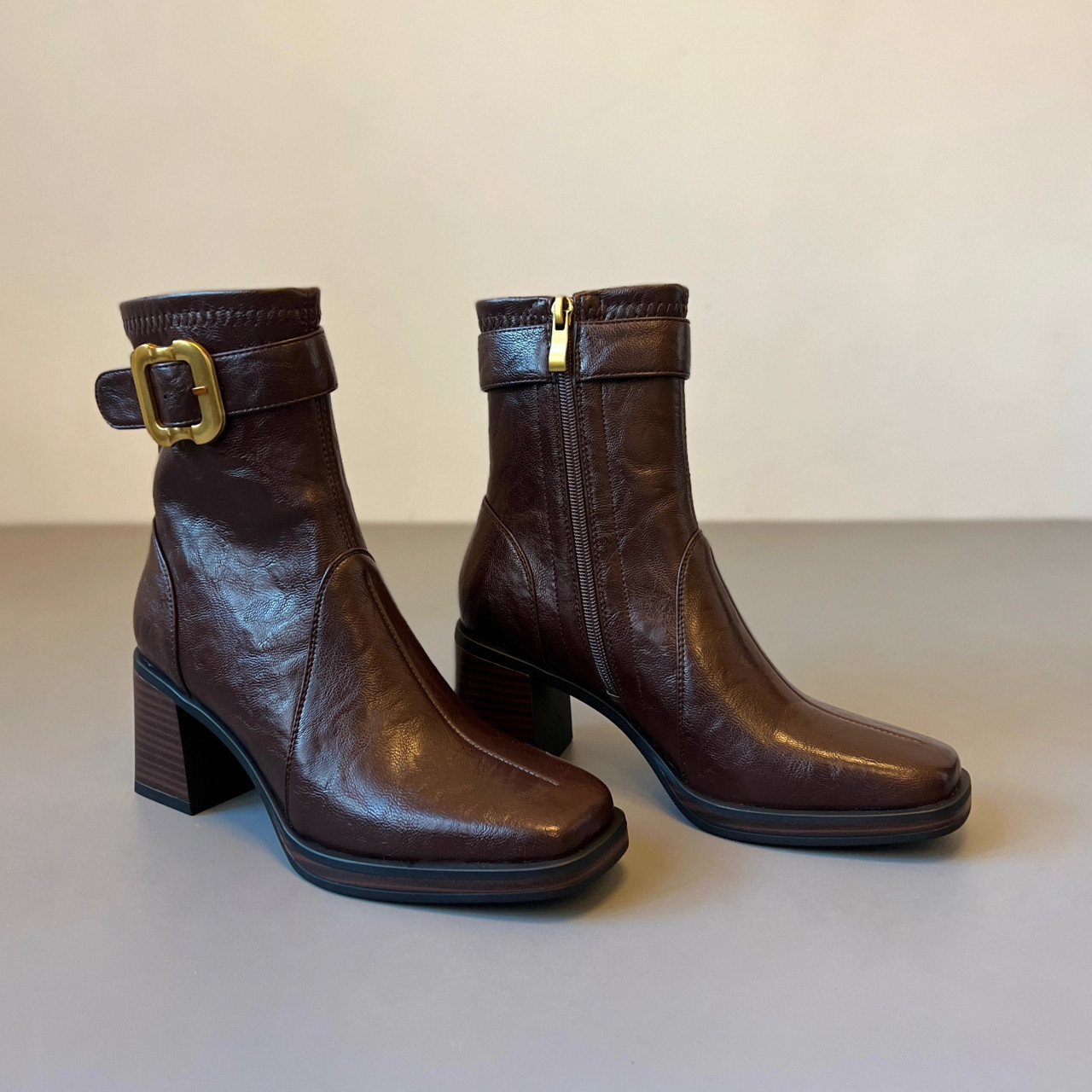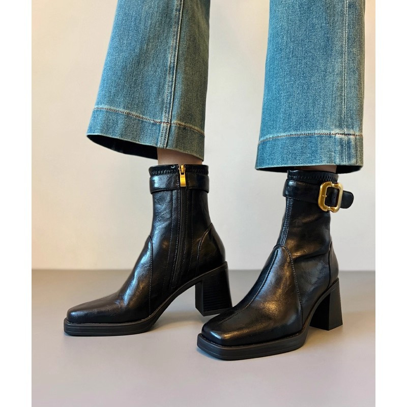 啄木鸟真皮弹力瘦瘦靴女2025新款高跟短靴粗跟时装靴马丁靴英伦风