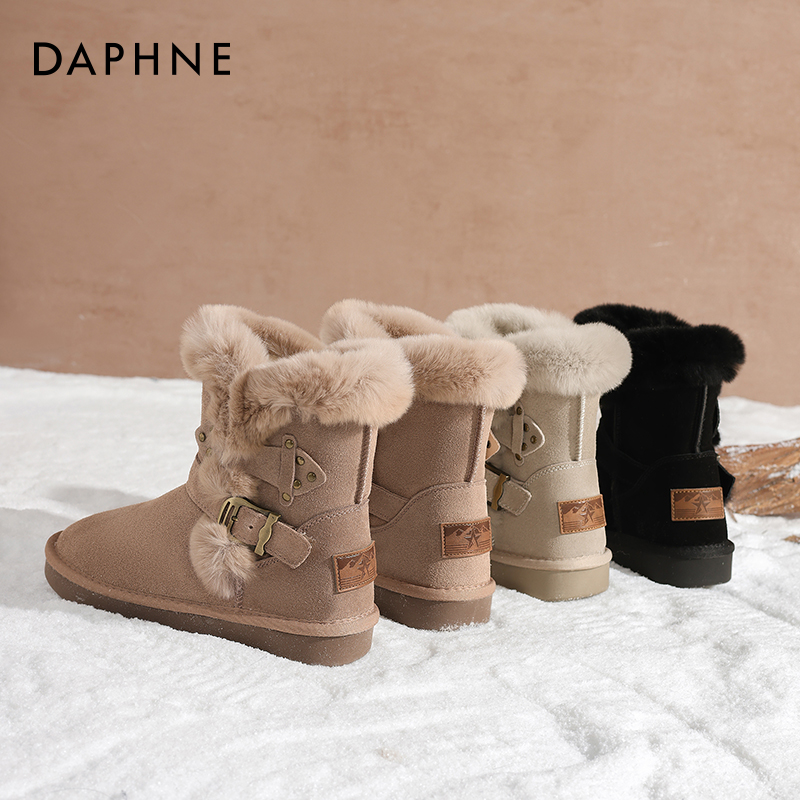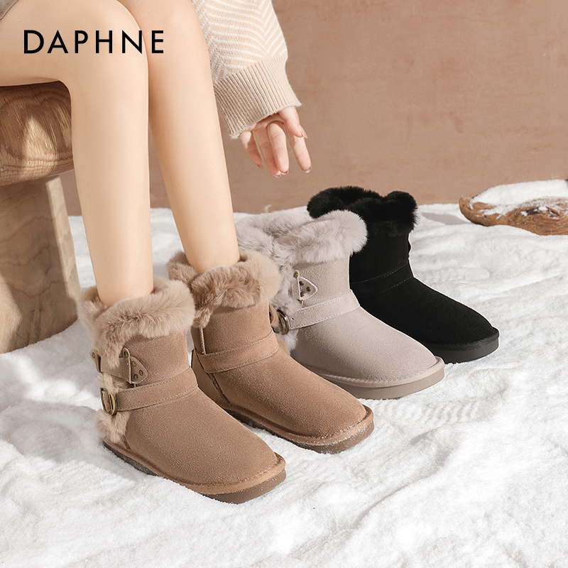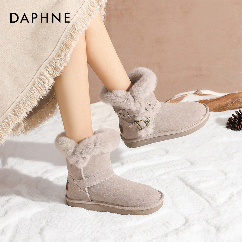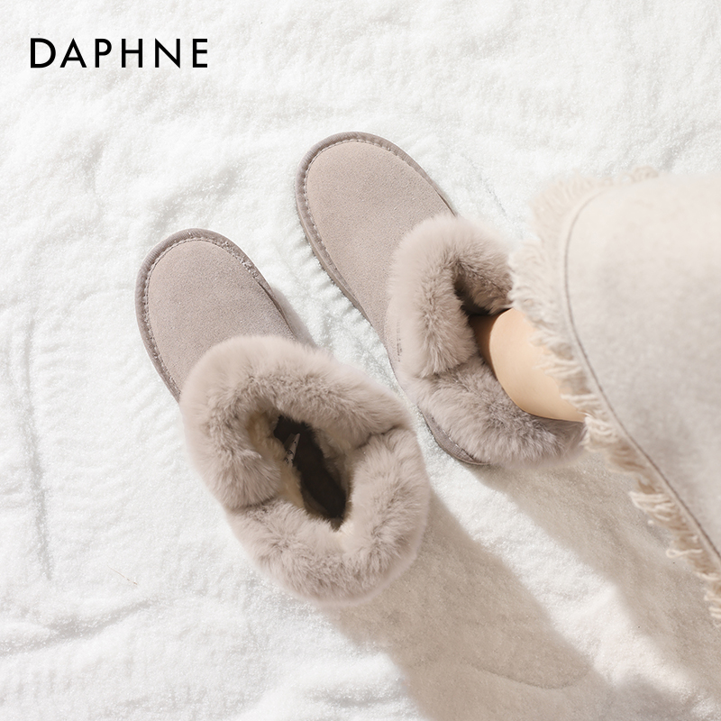 达芙妮雪地靴女2025冬季新款加绒灰色面包中筒厚底短靴子牛皮棉鞋