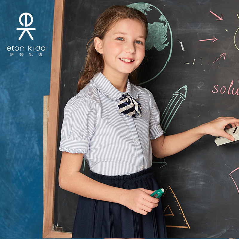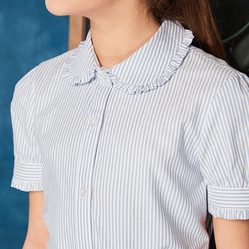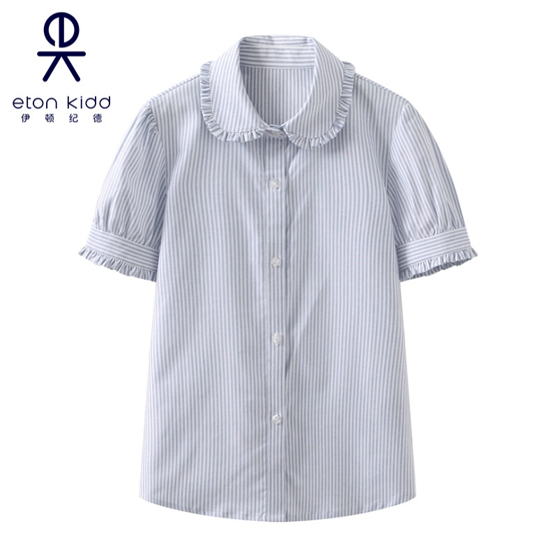 伊顿纪德校服细条纹牛津纺衬衣女童木耳泡泡袖短袖衬衫15C208预