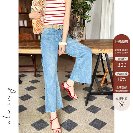 Elwing原创 浅牛仔蓝做旧毛边喇叭牛仔裤女夏季修身显瘦9分裤子