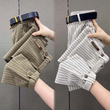 纯棉条纹休闲裤女秋季新款宽松高腰卷边工装裤百搭显瘦小脚哈伦裤