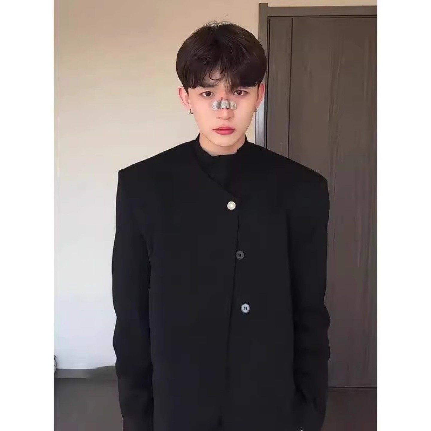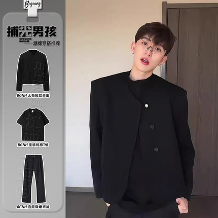 高级感男模西服韩版设计感短款无领垫肩小西装套装廓形小香风外套