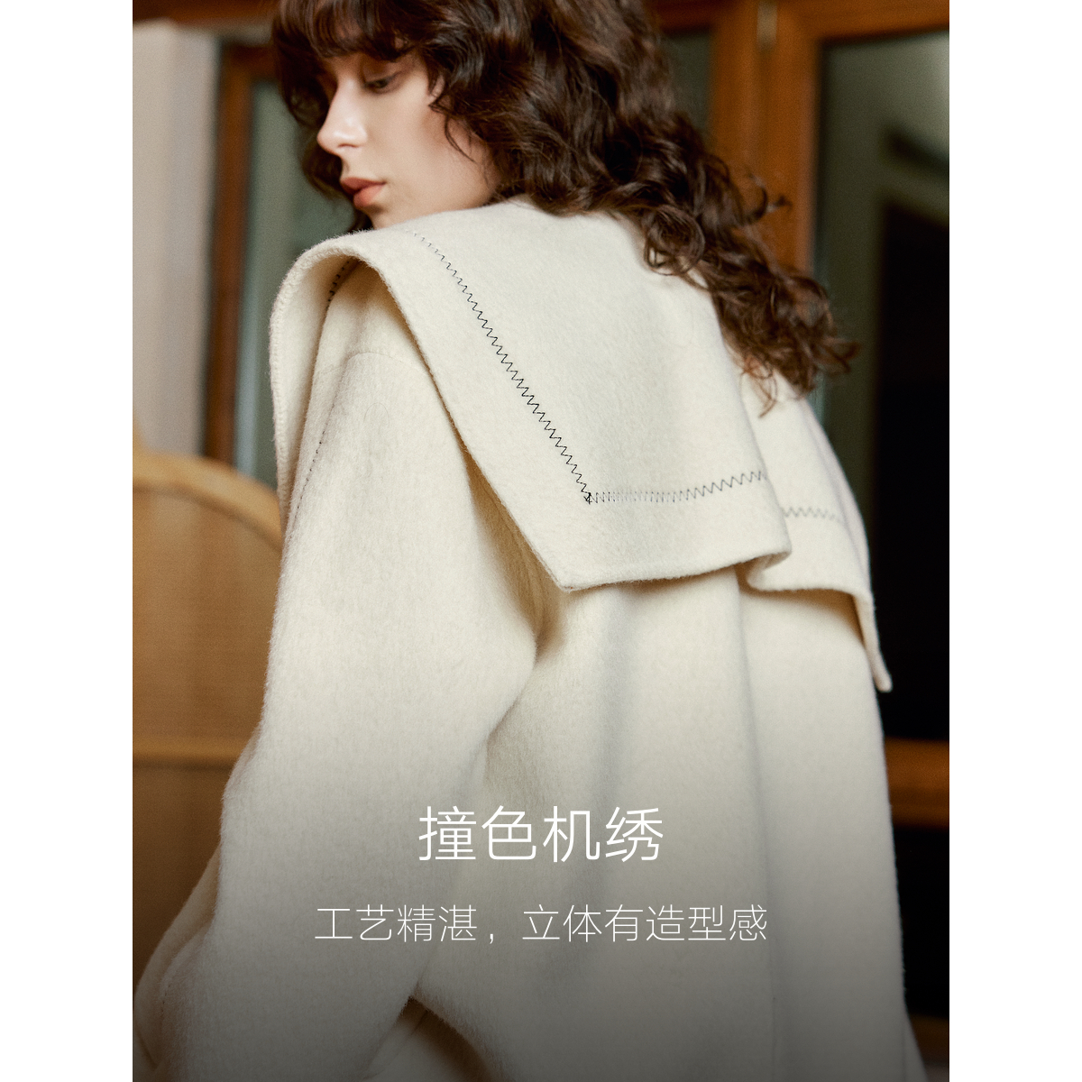 ELLE绵羊毛骆驼绒混纺双面呢大衣女2025冬季新款米白色毛呢大衣