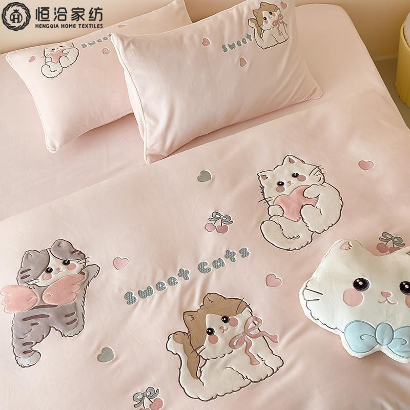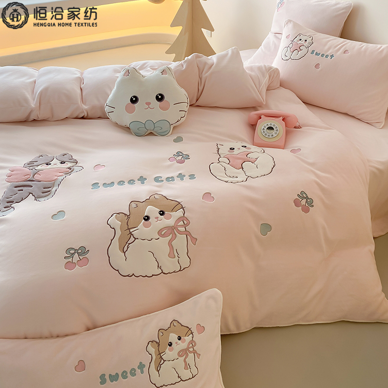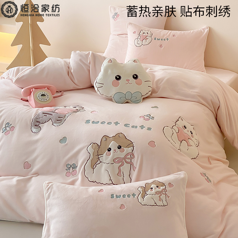 冬季加厚牛奶绒四件套新款可爱猫咪刺绣女孩儿童被套床品1.2粉色