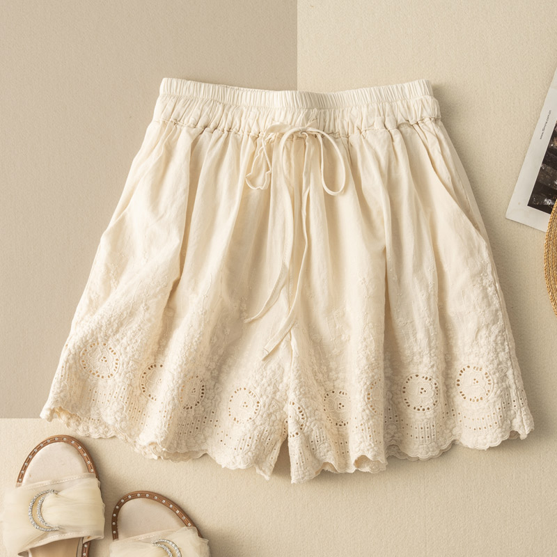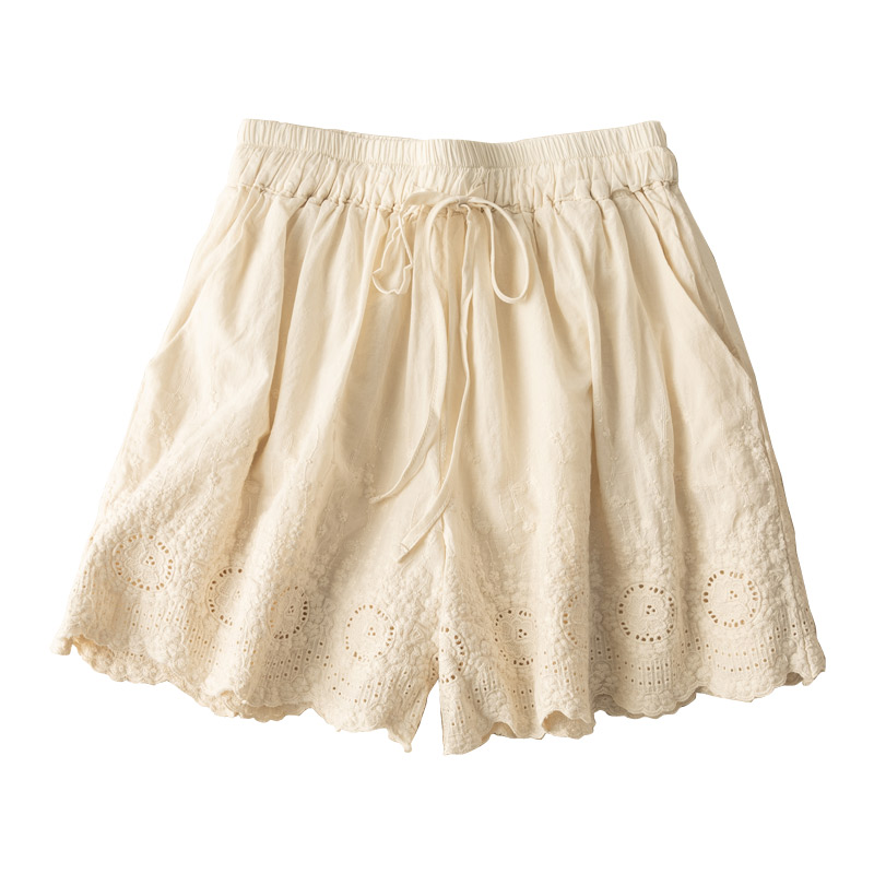 森女系夏季新款高腰小个子棉麻短裤双层防透显瘦休闲剌绣休闲短裤