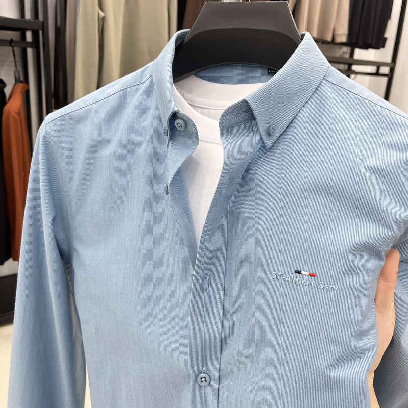 新款韩版宽松条纹长袖衬衫男商务休闲方领大码男士衬衣薄款春秋季