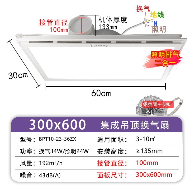 金羚集成吊顶换气扇300x600大功照明排率强力排风扇30*60铝扣大板