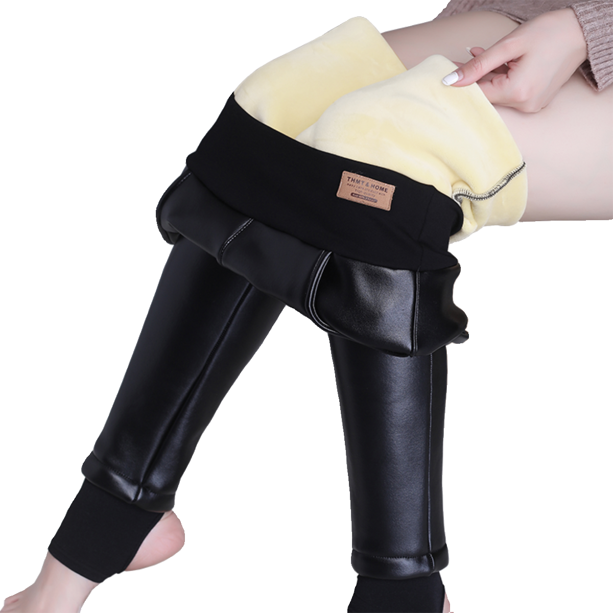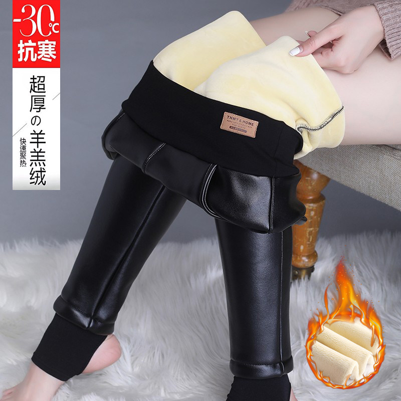 特厚羊羔绒PU皮保暖高腰皮裤