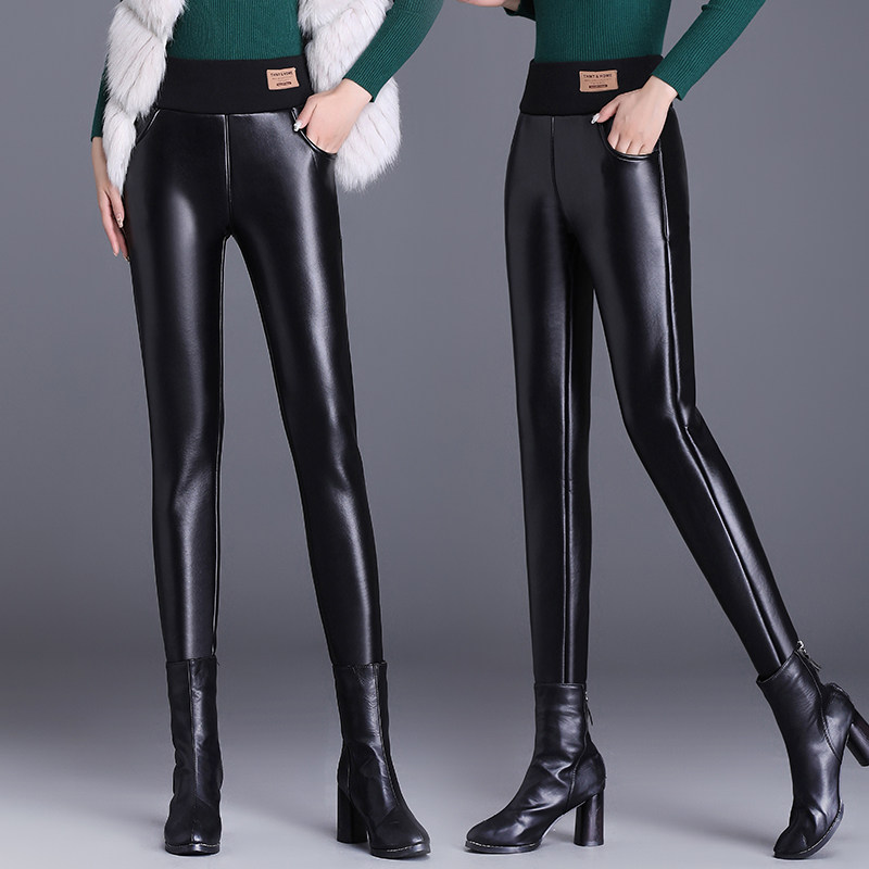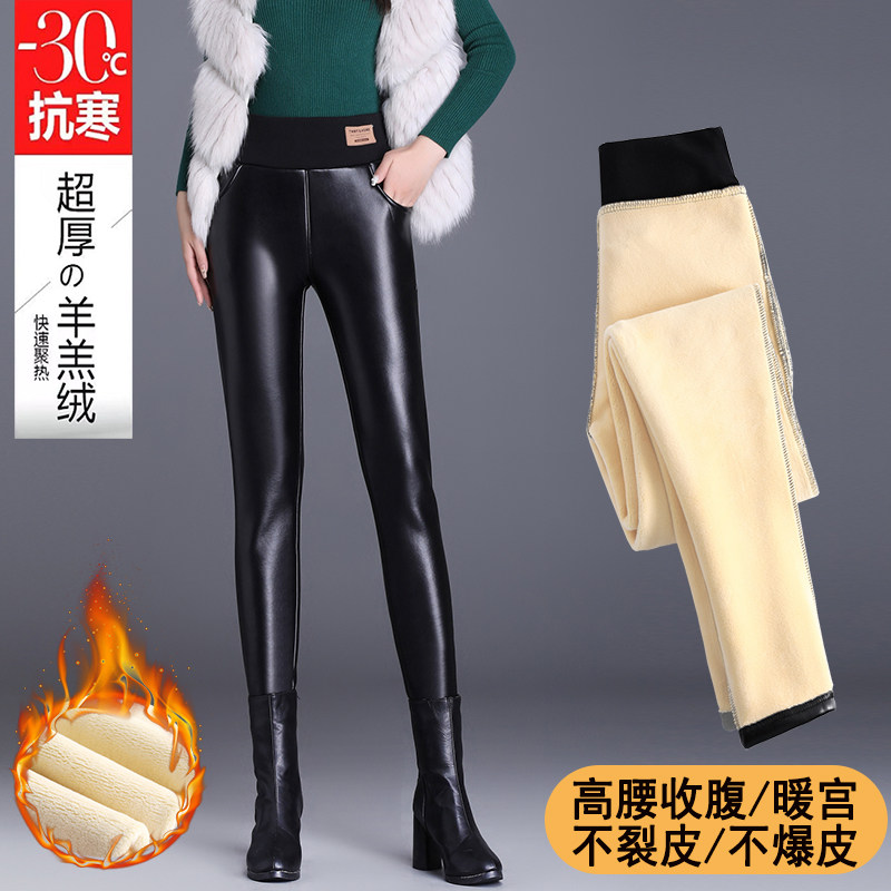 加绒皮裤女2025新款PU紧身高腰羊羔绒打底裤外穿冬季加厚亮皮裤子