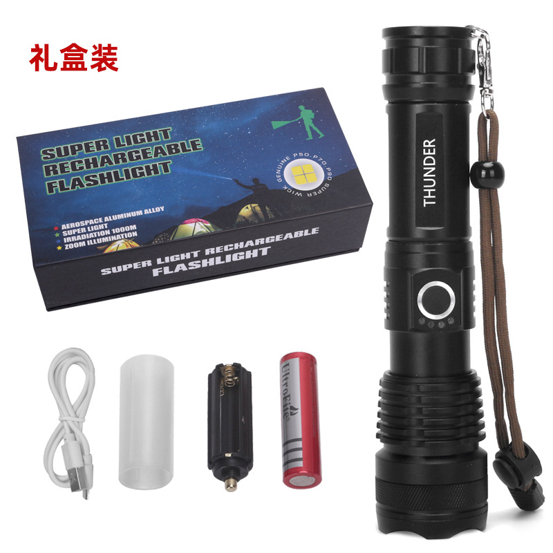 P50铝合金电筒变焦电量显示款USB充电款强光手电筒户外手电筒
