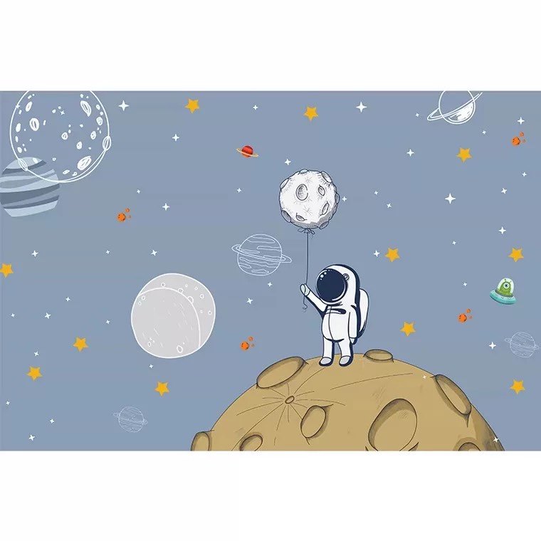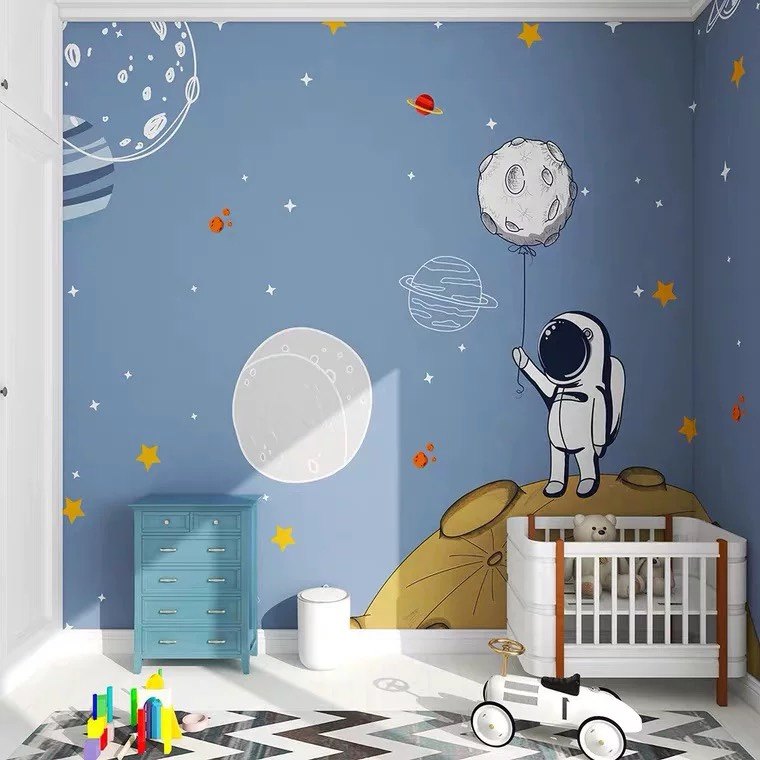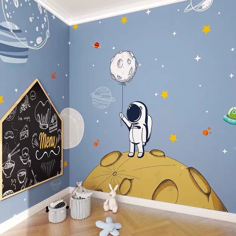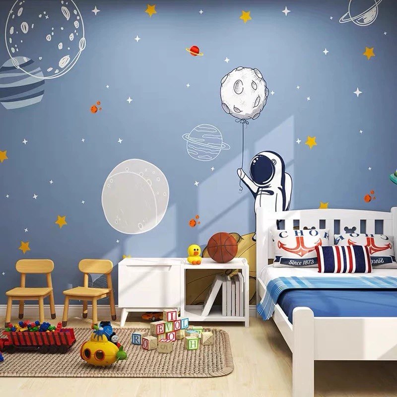 卡通蓝色星空儿童房墙纸太空星球宇航员男孩房壁布幼儿园环保墙布