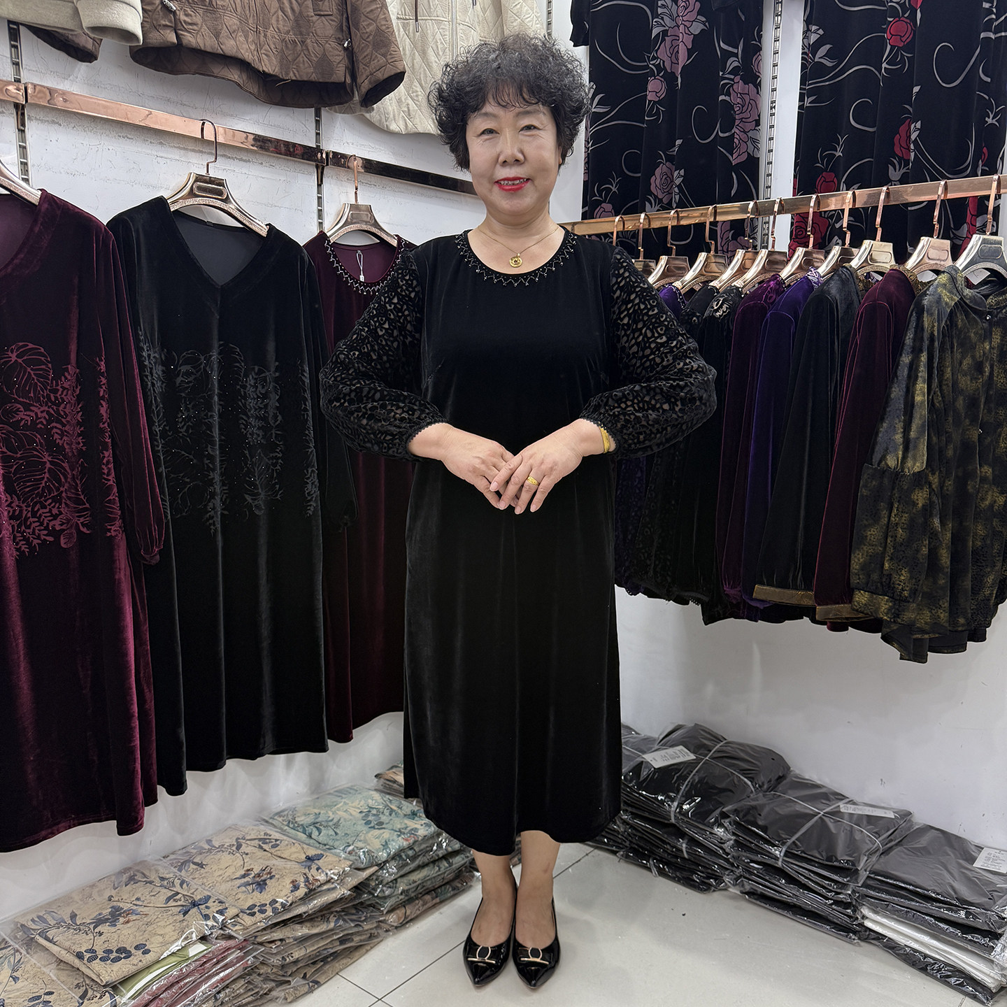 高级感中老年秋冬丝绒圆领时尚连衣裙女2025年红色中长款大码女装