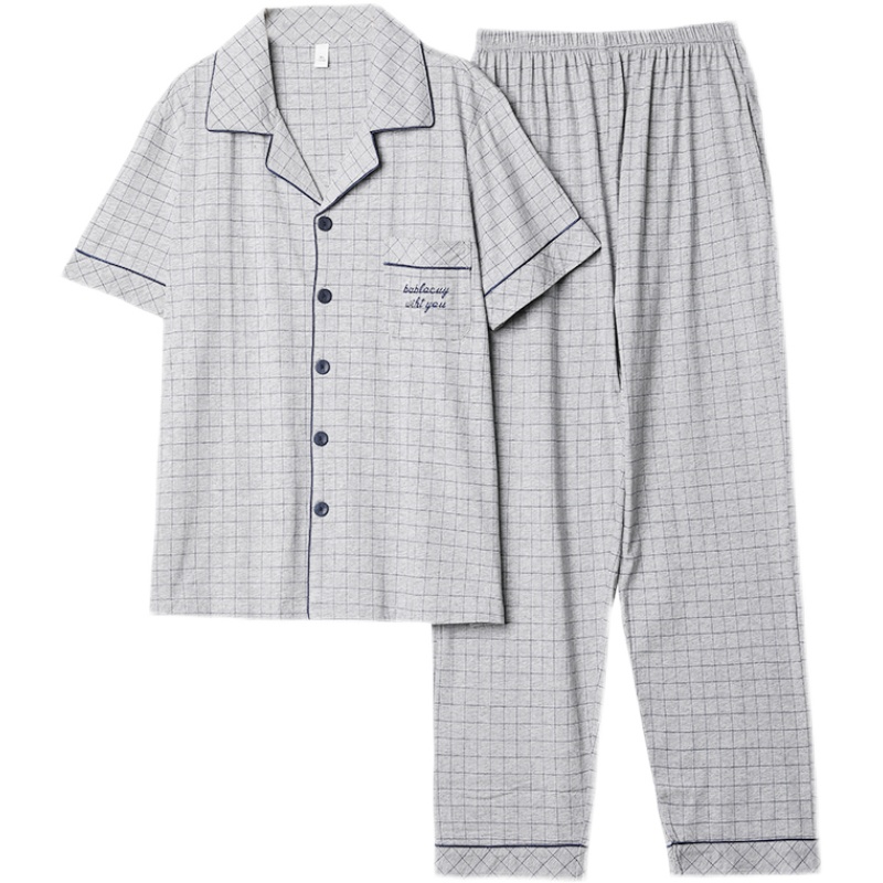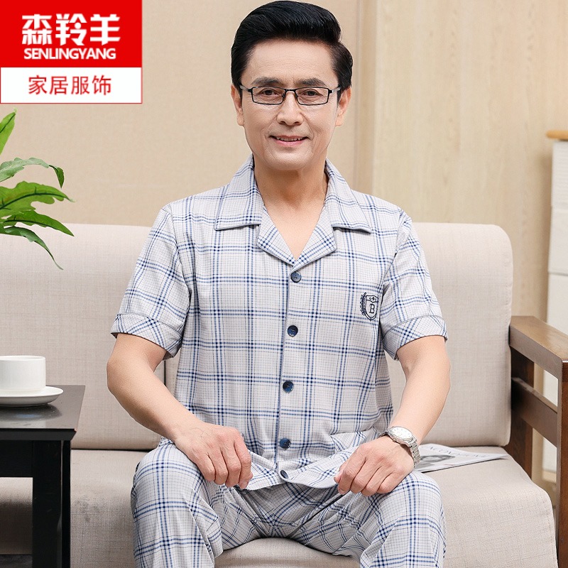 男士夏季短袖长裤纯棉开衫睡衣套装加肥加大码中T年爸爸家居服薄