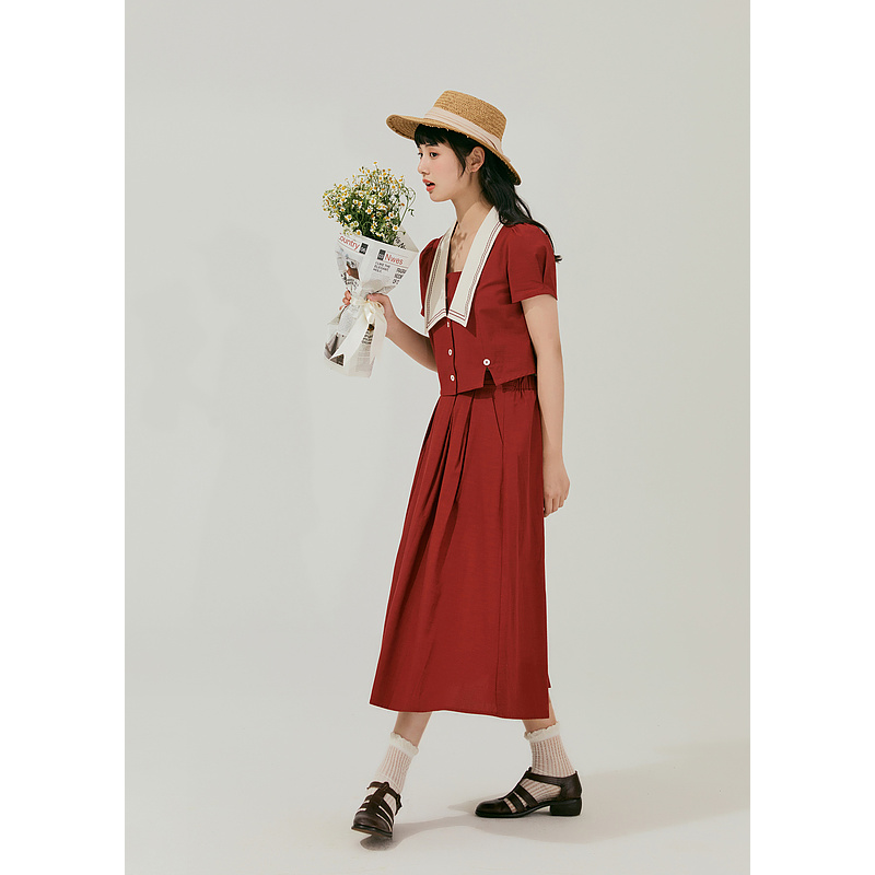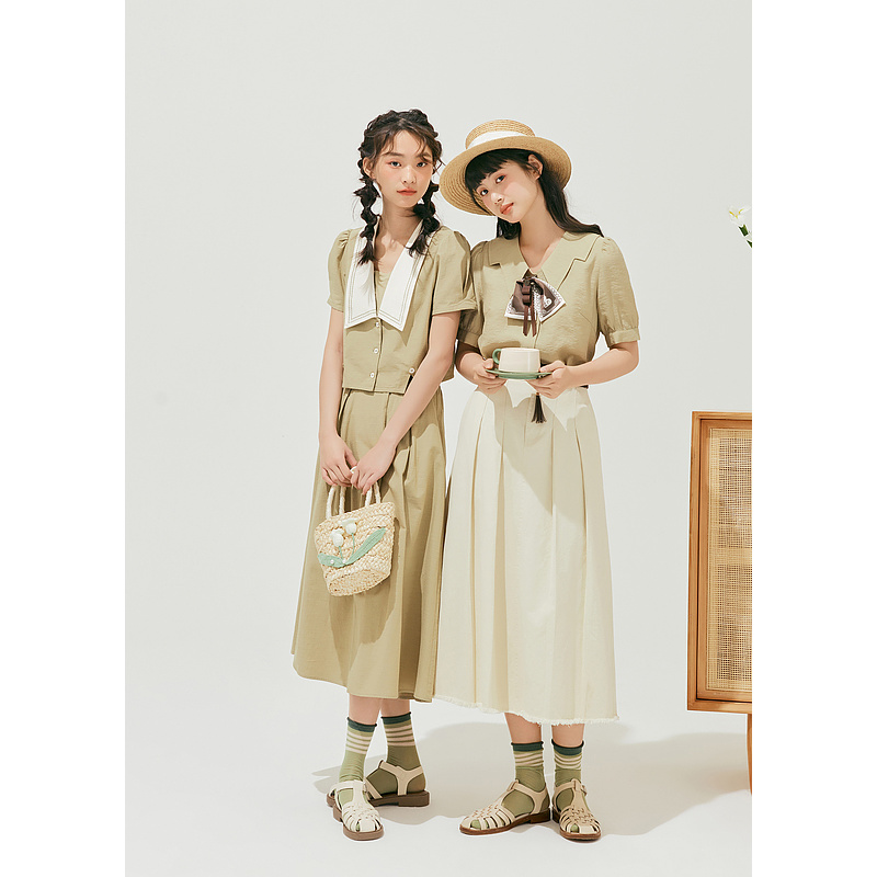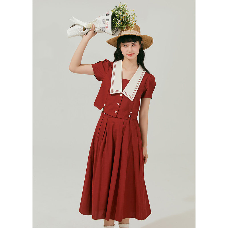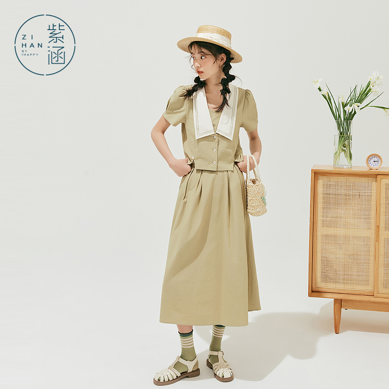 紫涵撞色翻领裙子套装复古文艺小衫两件套女夏季新款小众精致休闲
