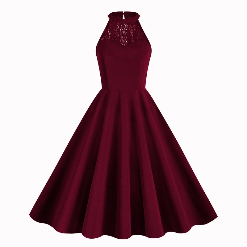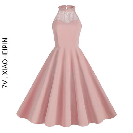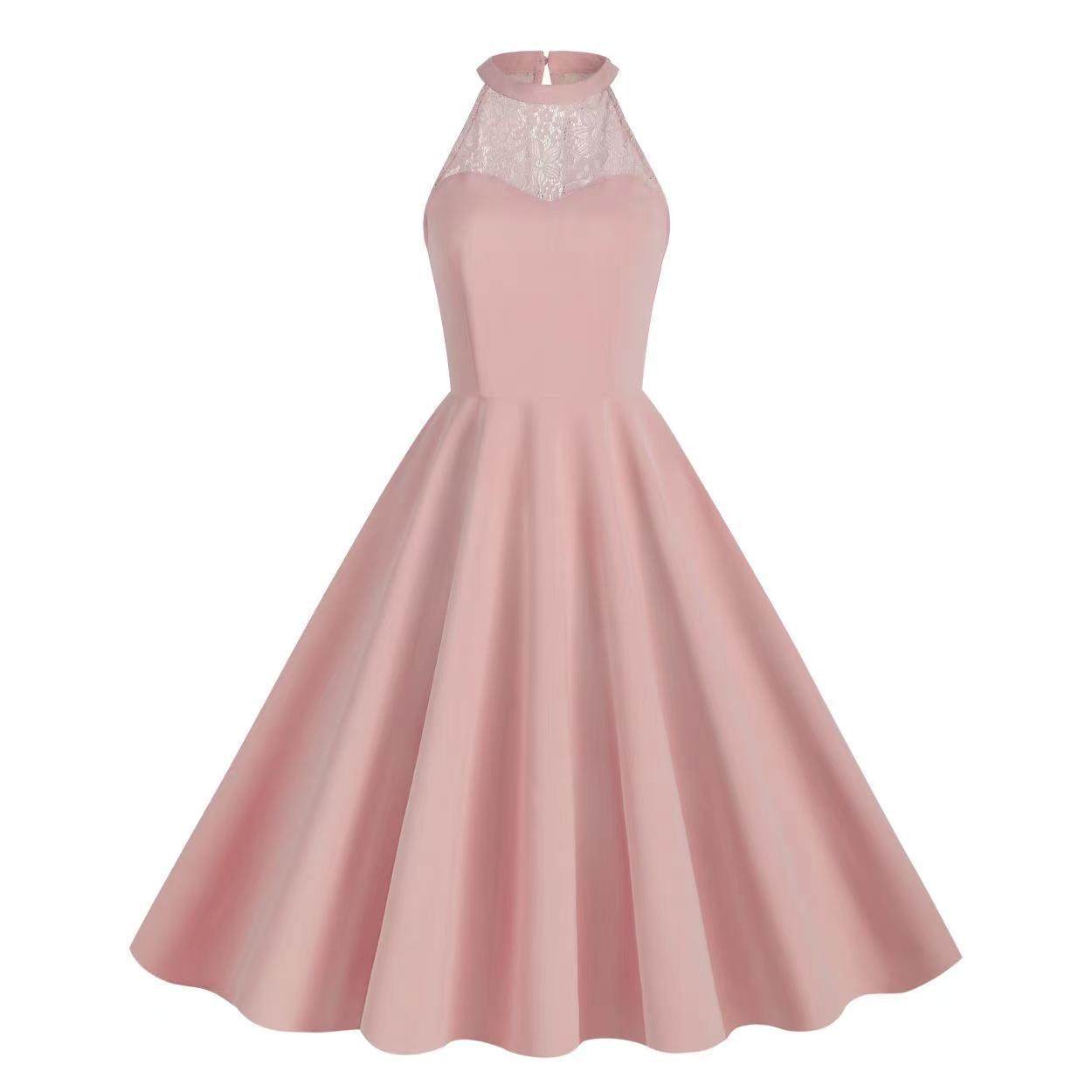 欧美女装挂脖无袖蕾丝拼接连衣裙礼服伴娘粉色收腰气质大摆垂感裙