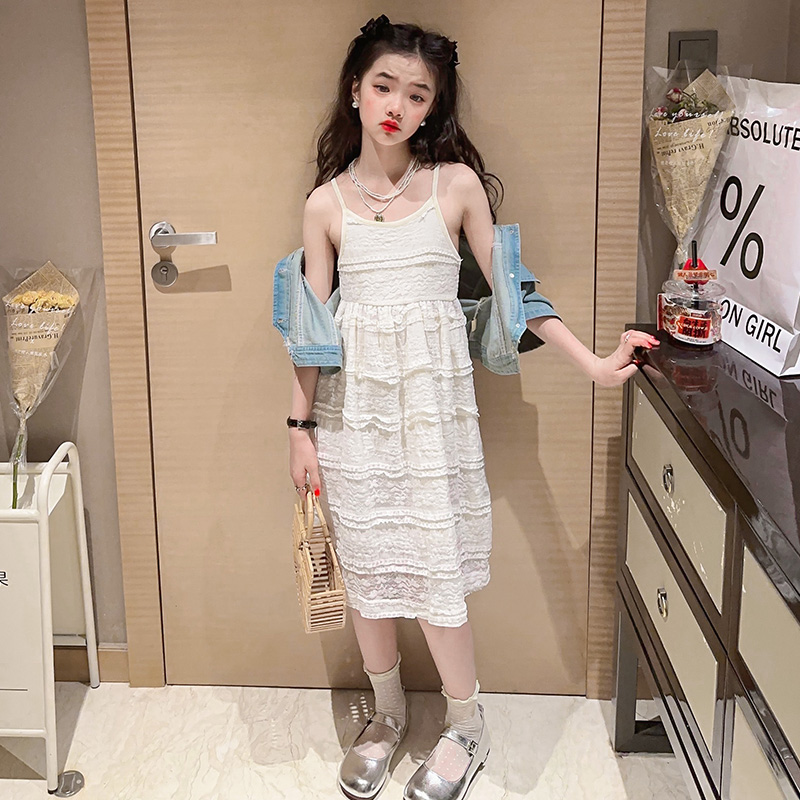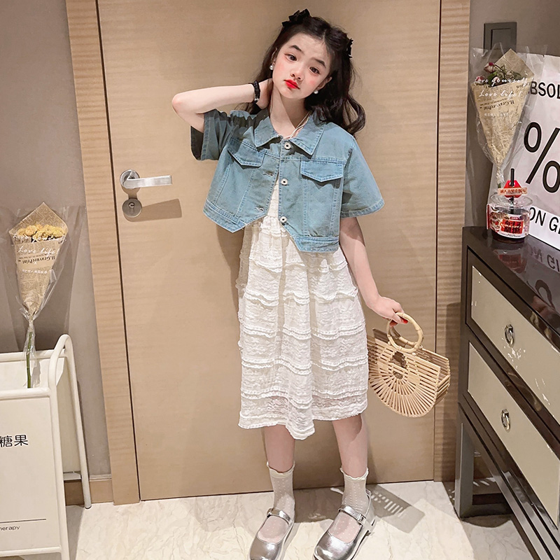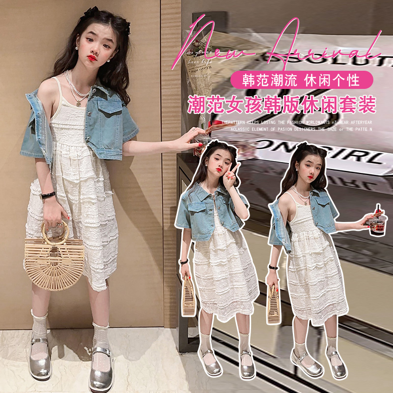 女童连衣裙洋气套装夏天韩版潮范短款牛仔外套吊带公主裙子两件套