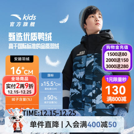 雪壳热返安踏儿童男童羽绒服三防外套2025冬季新款加厚保暖上衣