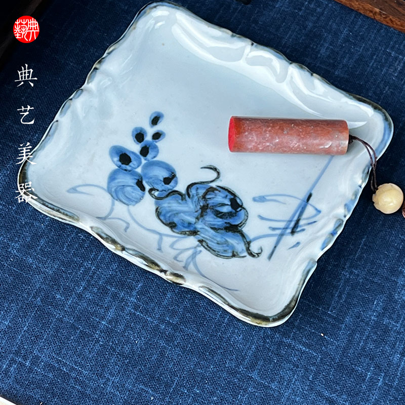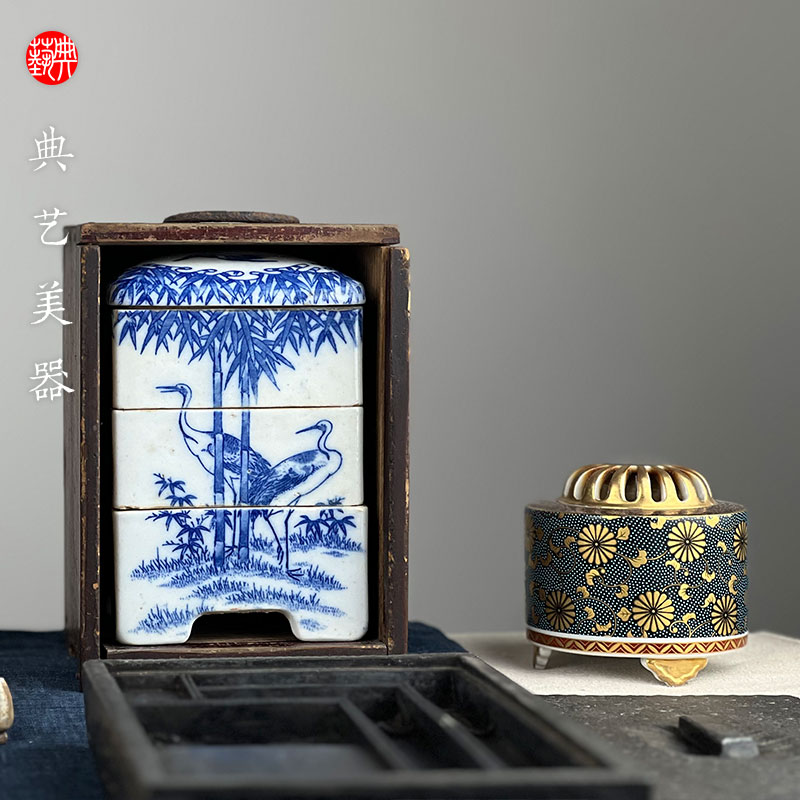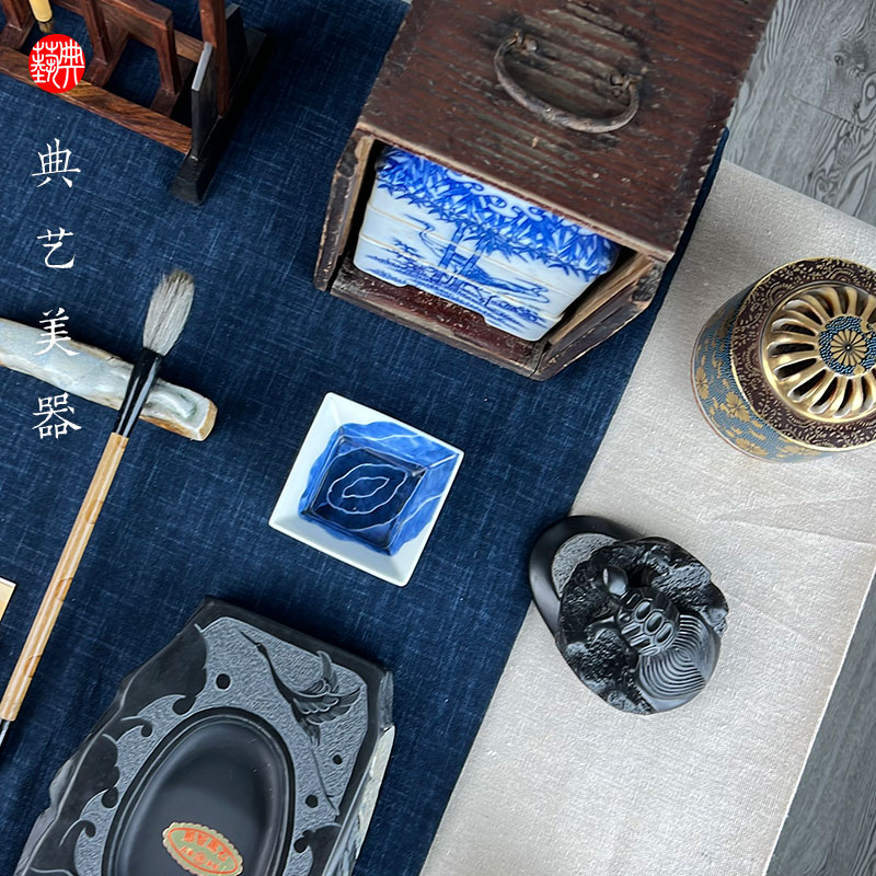 日本九谷青粒香炉染付笔舔那智黑砚台三段重亁山绘方碟中古