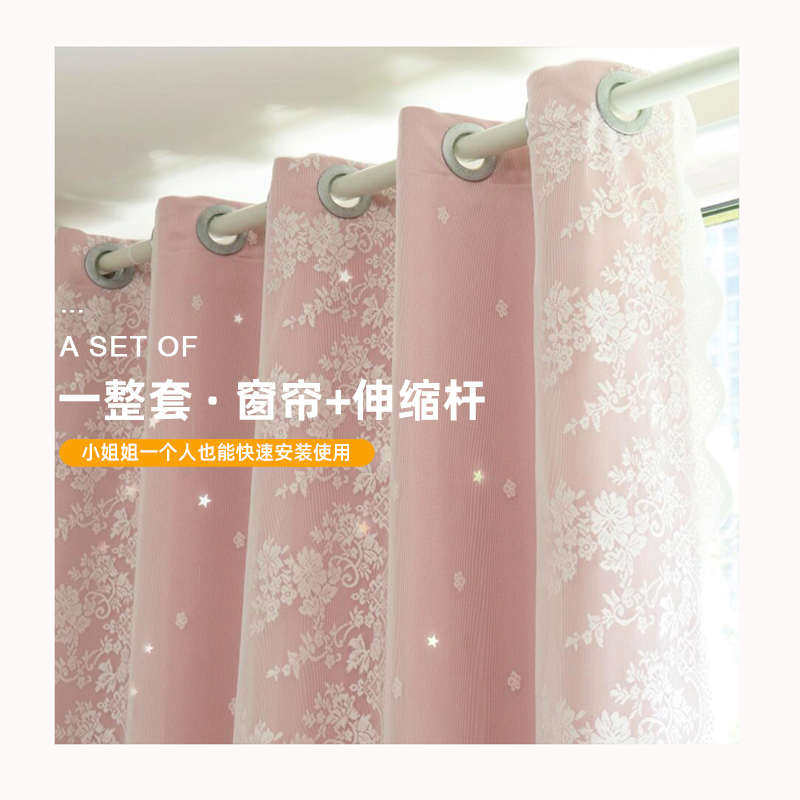 飘窗窗帘免打孔安装公主风房间卧室全遮光布奶茶色布纱一体伸缩杆
