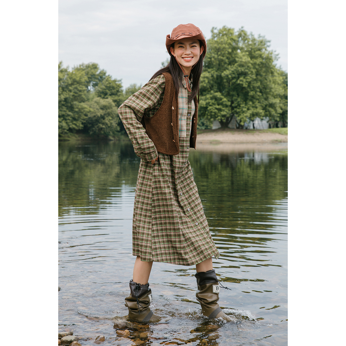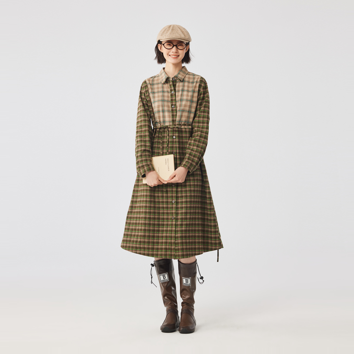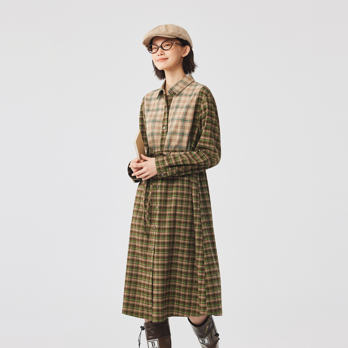 飞鸟和新酒拼接格子连衣裙女中长款大码时尚新款宽松衬衫女裙