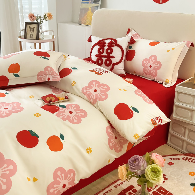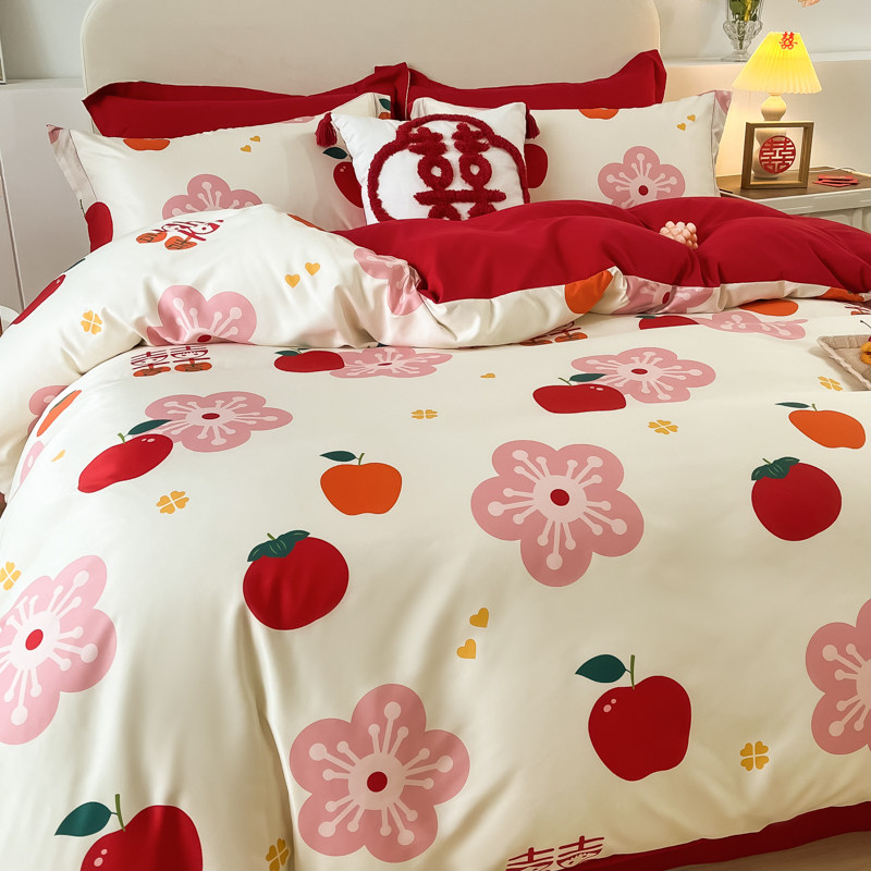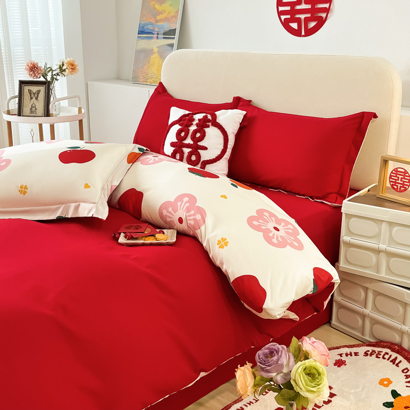 高端亲肤棉磨毛四件套数码印花大红被套婚庆喜事床单款床上用品被
