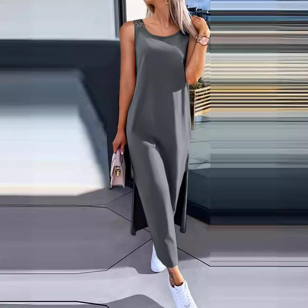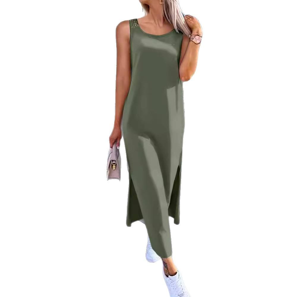 新款 2024亚马逊 速卖通 夏季简约纯色后背花边无袖连衣裙通勤风