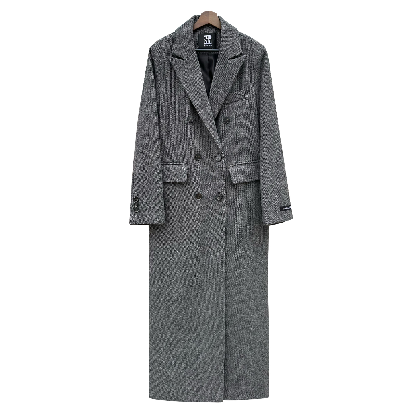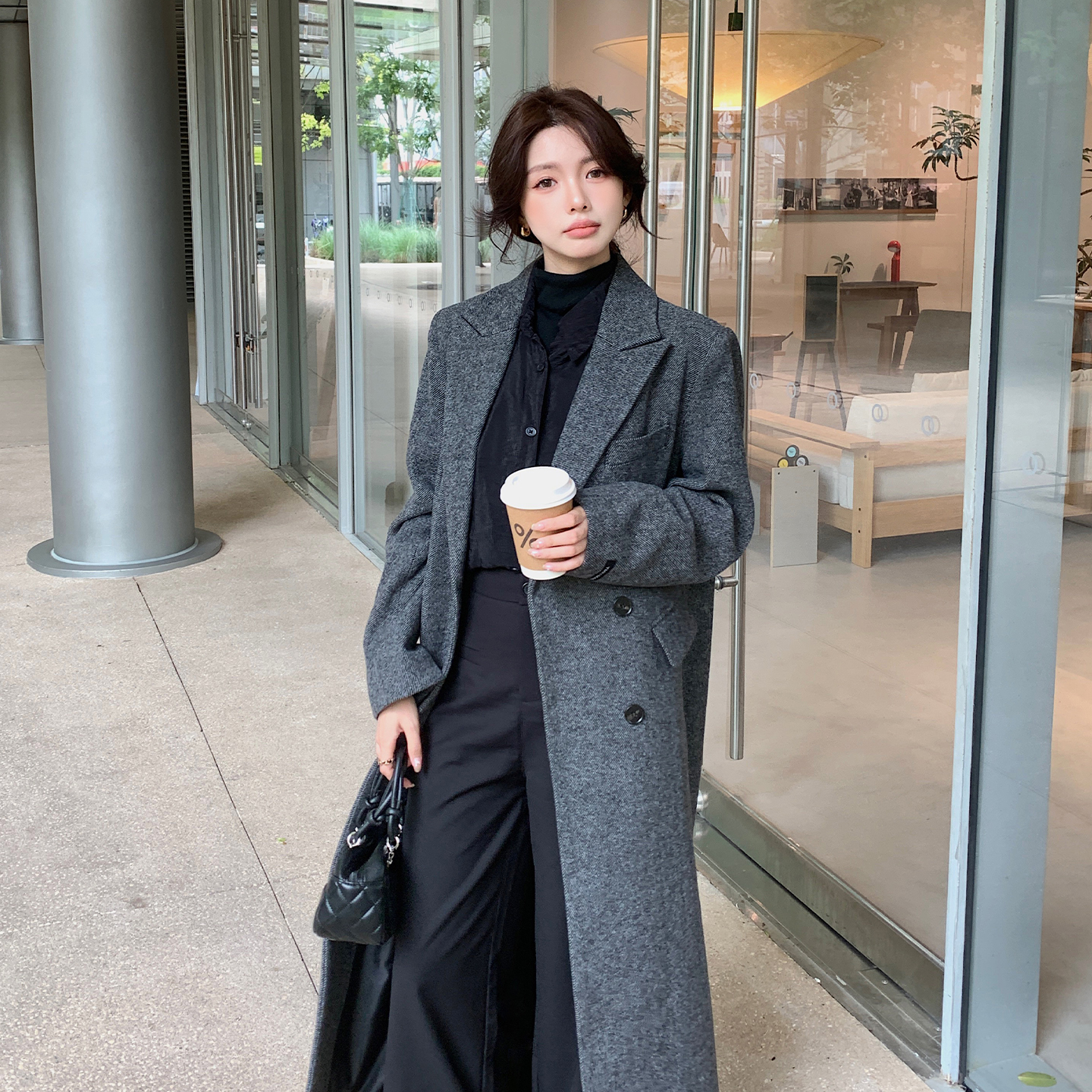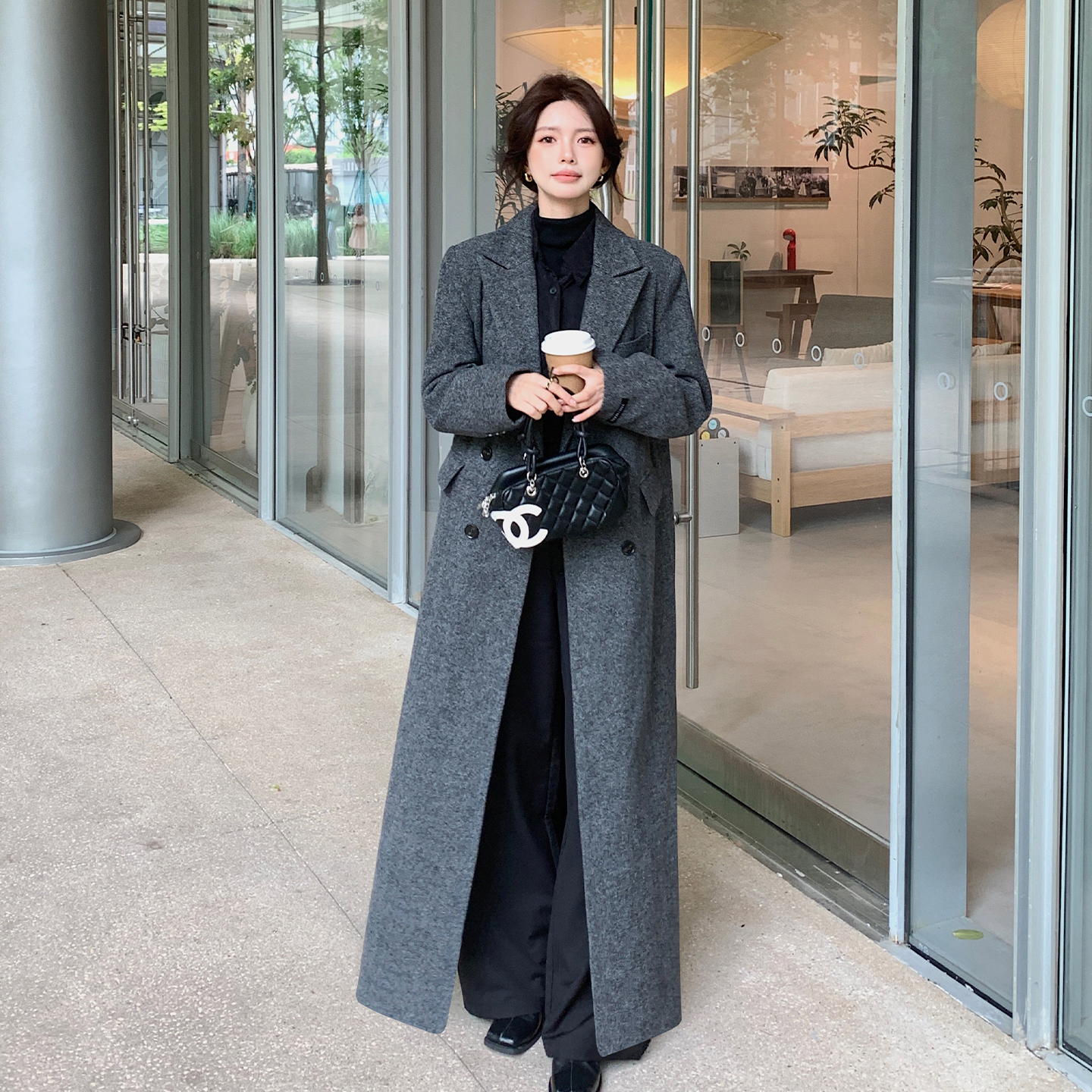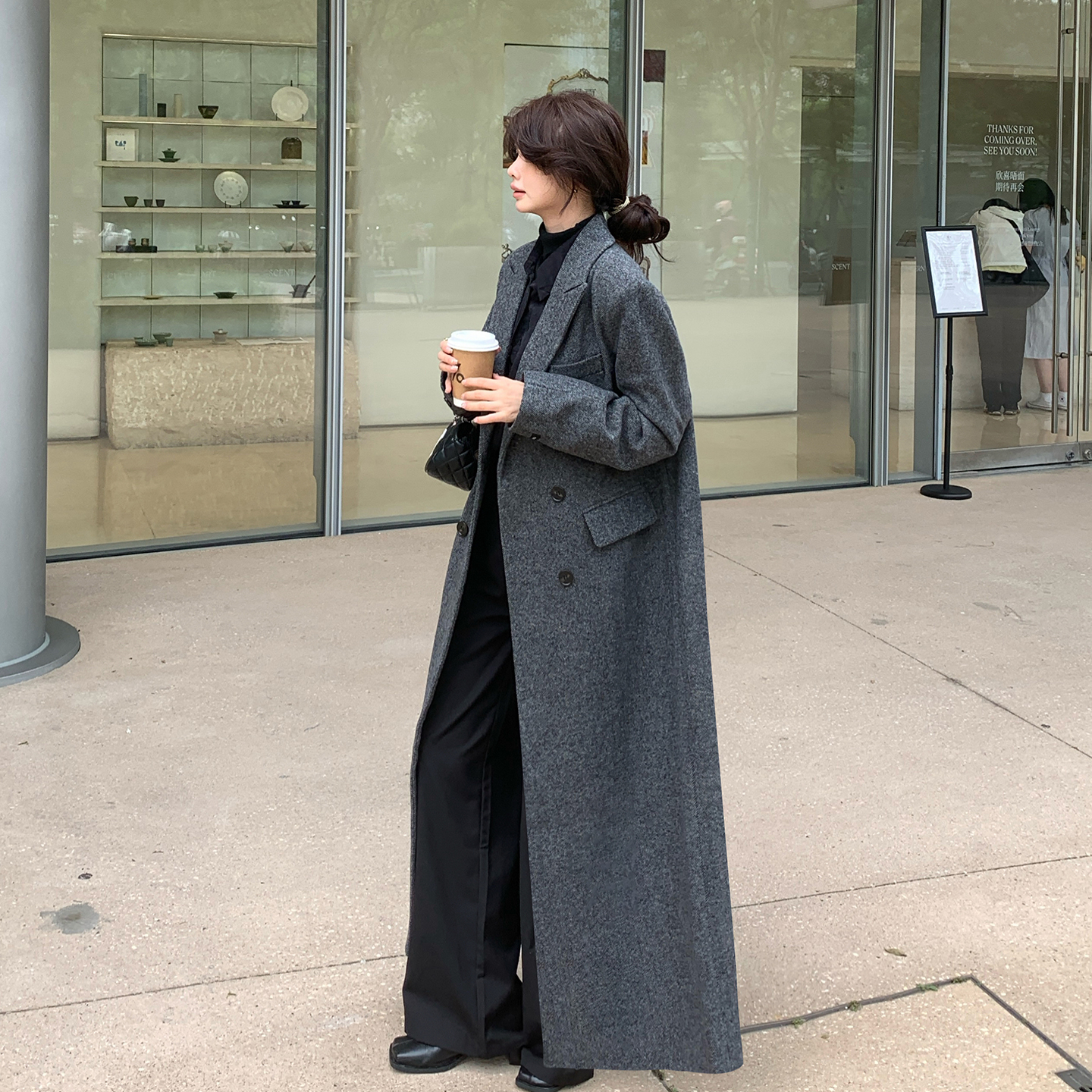 格子毛呢外套女超长宽松新款加厚秋冬季高级感高个子羊毛呢子大衣