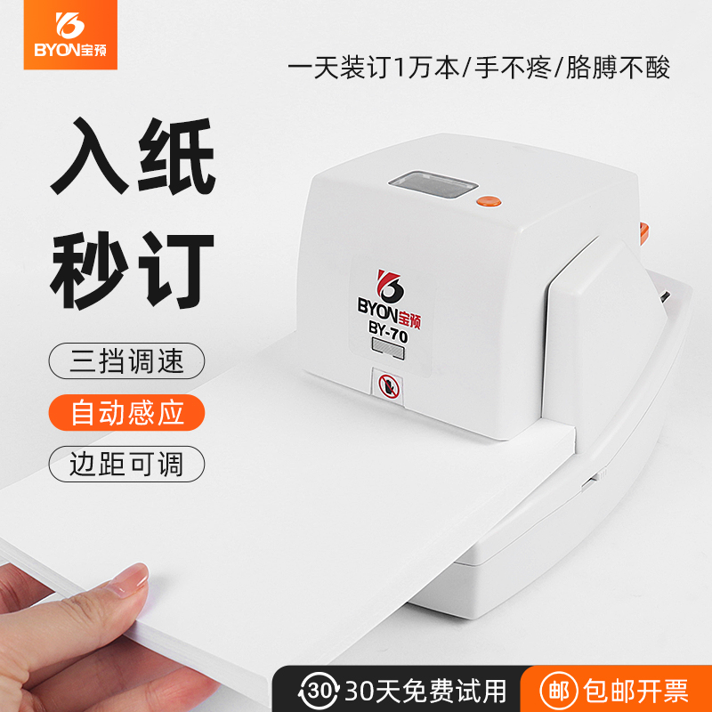 宝预BY-50/70电动订书机办公室小型自动感应装订机文件凭证订书器全自动装订器a4纸钉书机平订角钉70页订厚书