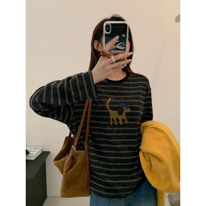 灰色条纹卡通小狗印花长袖T恤女2025秋冬新款宽松内搭打底衫上衣